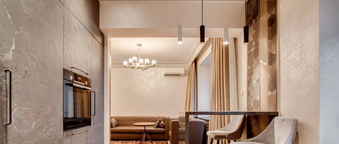 Полностью авторский дизайн-проект. Все материалы премиального класса, преимущественно зарубежные. Декоративная штукатурка ручной работы на стенах гостиной. В спальне — акцентная стена из состаренного кирпича ручной кладки. Каменные подоконники. Паркет из массива с патиной — имеются следы естественной эксплуатации.