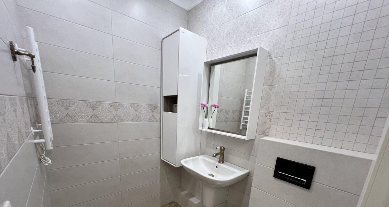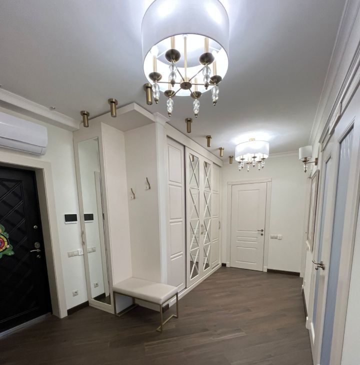 Новый качественный ремонт из дорогих материалов, два санузла, один с/у с ванной, теплые полы, система охлаждения воздуха, встроенная мебель в прихожей, кухне остается покупателю.
