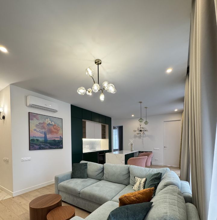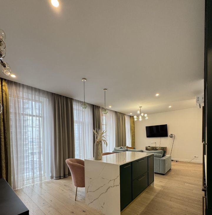 Сдается стильная трехкомнатная квартира в современном монолитном доме 2021 года постройки. Апартаменты расположены на 8 этаже 10-этажного здания. Общая площадь квартиры составляет 75,2 кв. м, а кухня — просторные 35 кв. м. Высокие потолки в 3 метра создают ощущение простора и света. В квартире 10 окон в пол, на 2 стороны и потрясающие виды на закат.