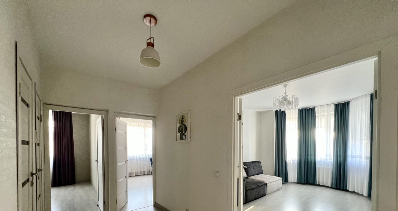 Общая площадь составляет 73 м2, три изолированные комнаты со всей необходимой мебелью, раздельный санузел, застекленная лоджия.