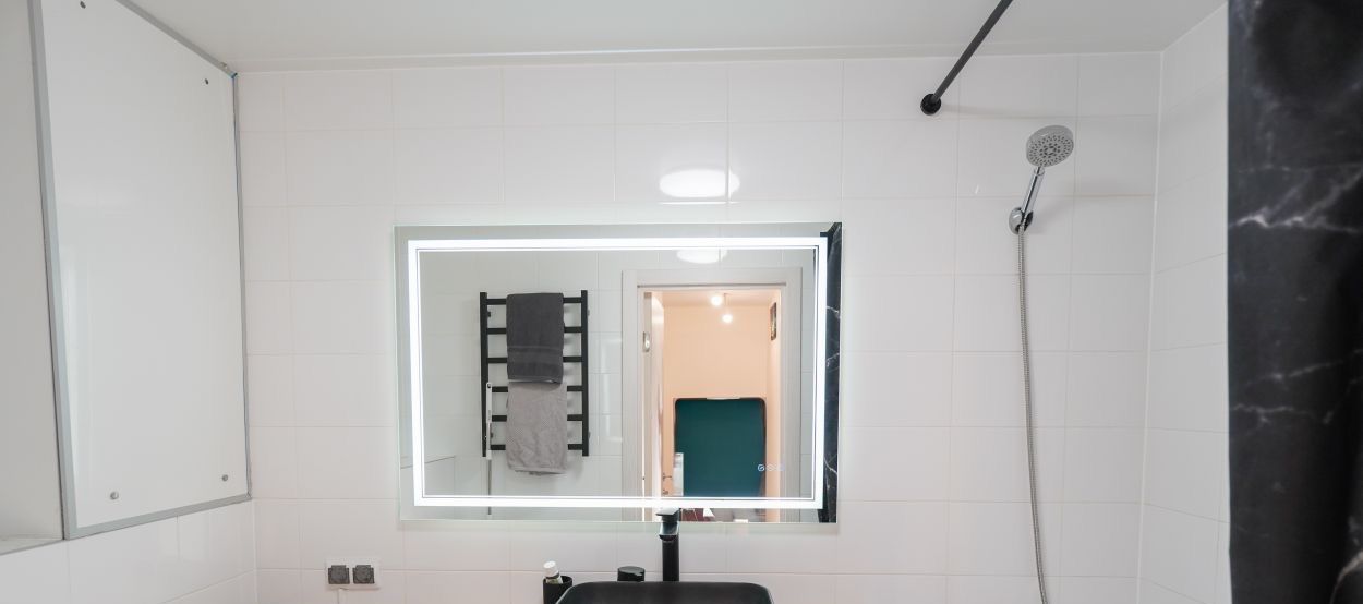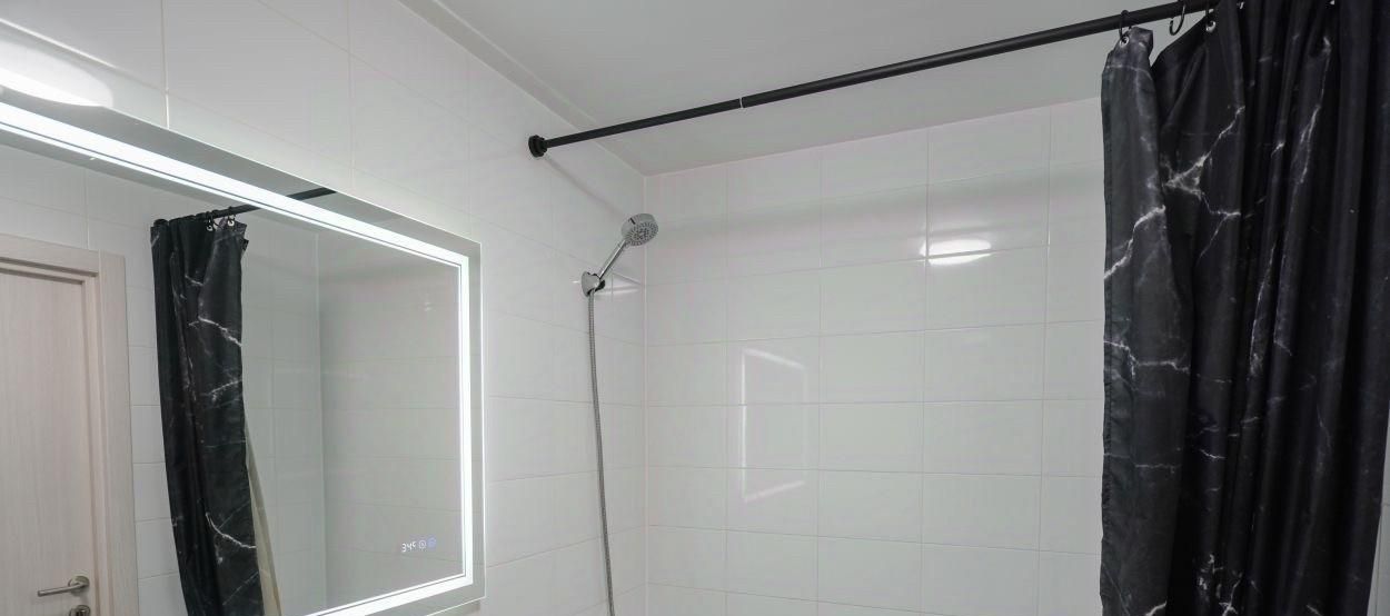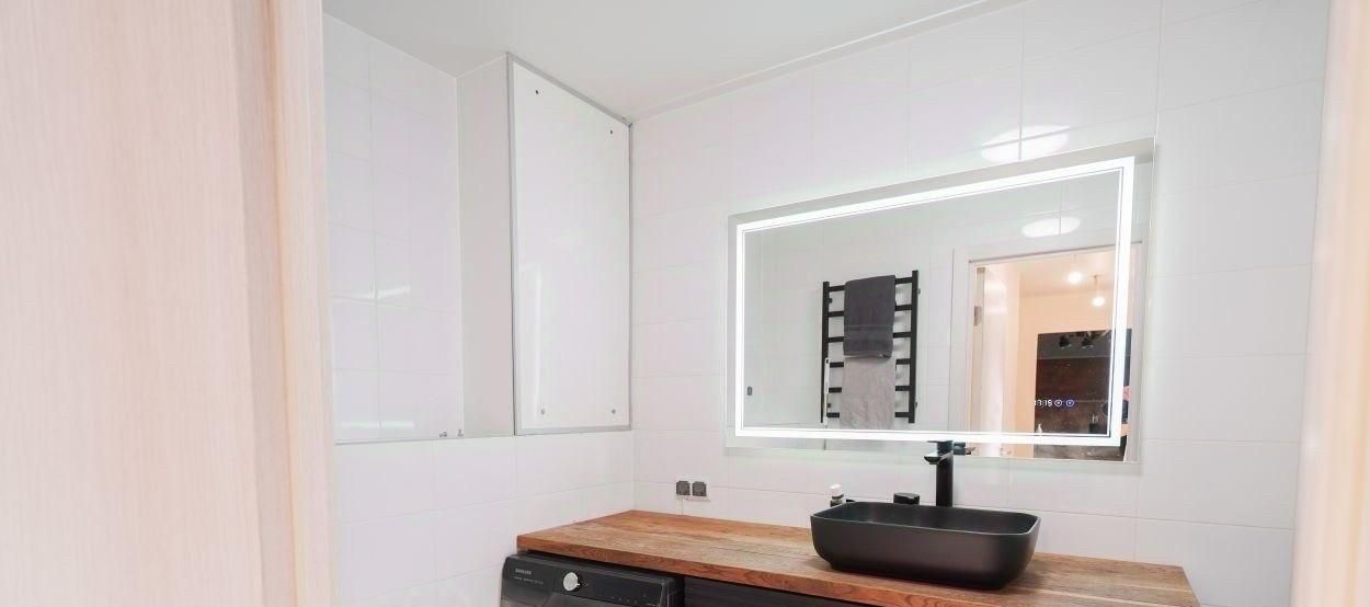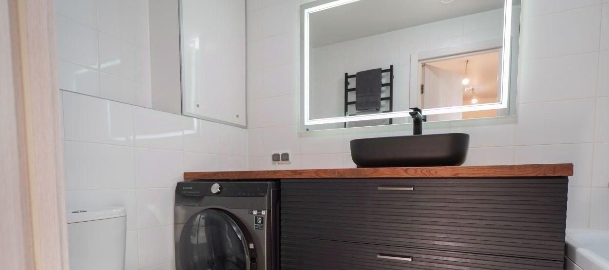 • Просторная ванная с ванной, большим зеркалом и стиральной машиной Samsung на 9 кг.