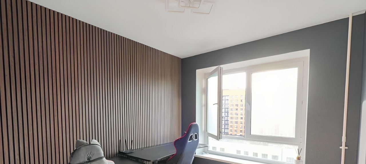 • Вторая комната — как кабинет или игровая, с двумя столами и стильной отделкой.