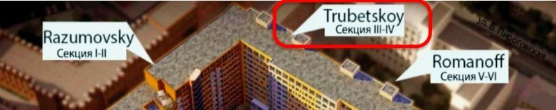 Квартира расположена в лучшей части комплекса, в дальней его части от дороги, в секции 3-4 Trubetskoy.
