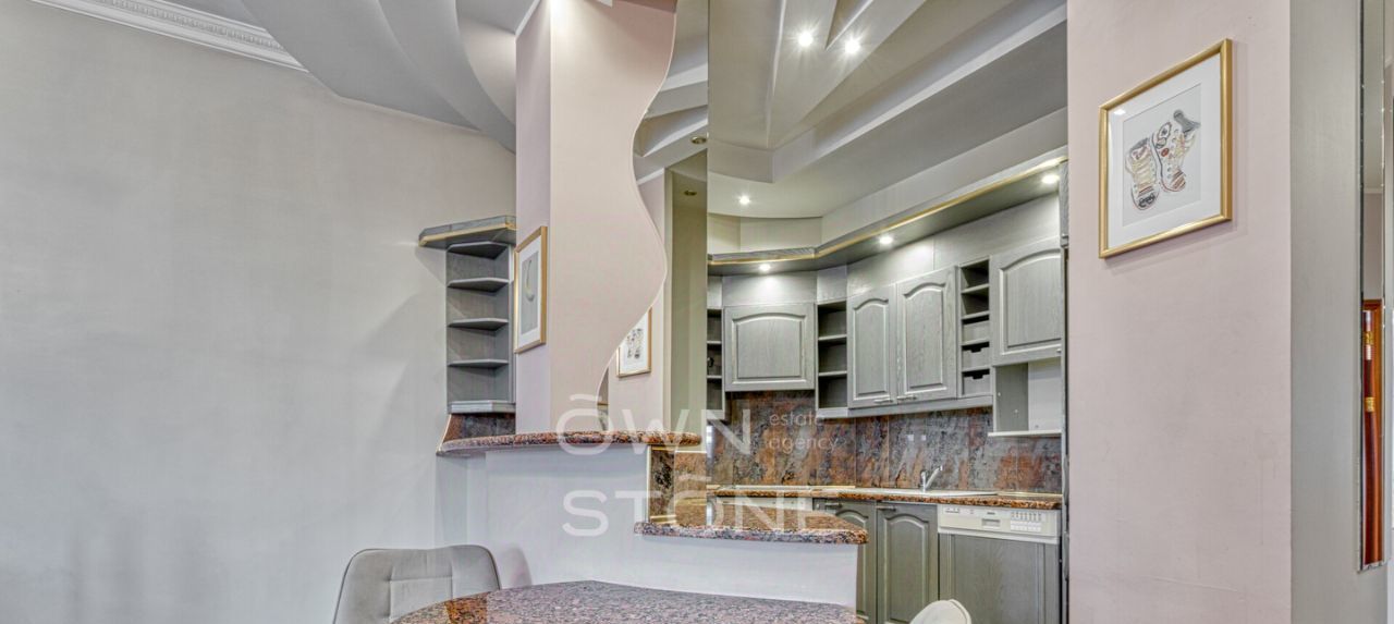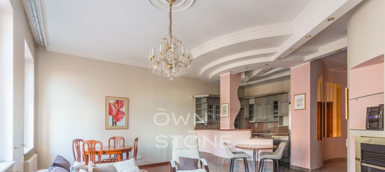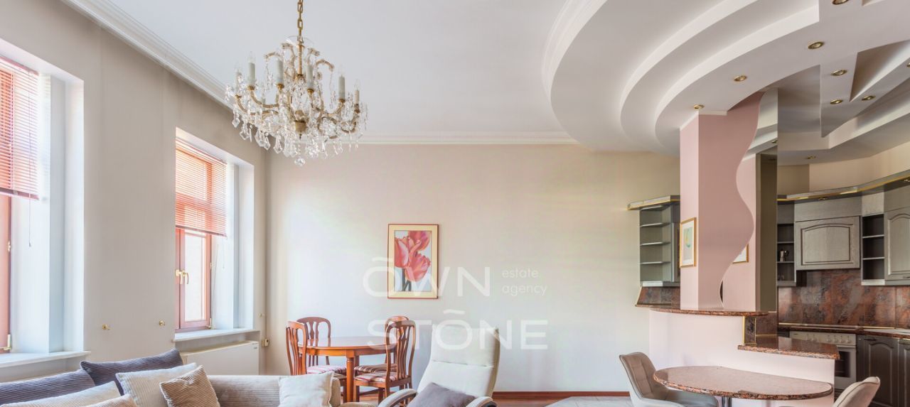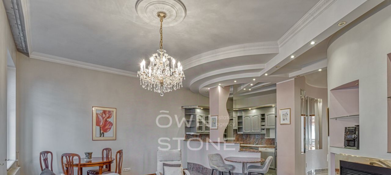Пространство продумано до мелочей и грамотно зонировано. Высота потолков 3,1 м создает ощущение воздуха и свободы. Выполнен современный дизайнерский ремонт с использованием натуральных материалов: камня и дерева.