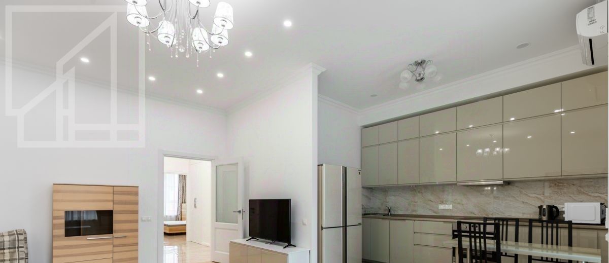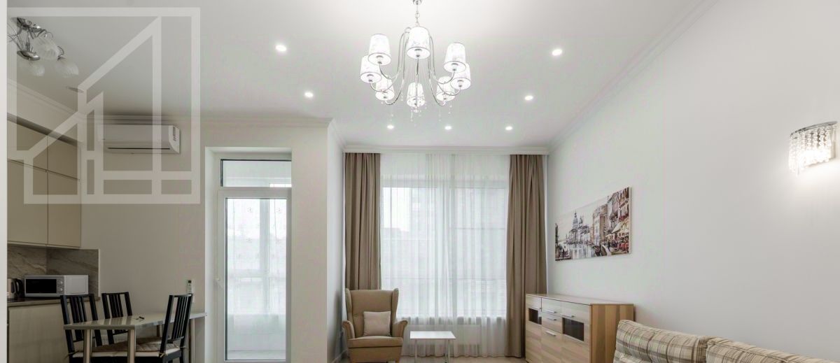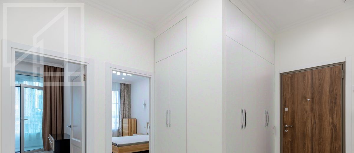 Планировка: просторная кухня-гостиная с обеденной зоной и выходом на лоджию, спальня, жилая комната (можно использовать как спальню или кабинет), балкон, два совмещенных санузла с ванной и душевой кабиной, прихожая. Квартира меблирована, укомплектована необходимой бытовой техникой. Квартира оформлена в спокойных тонах, в современном элегантном стиле.