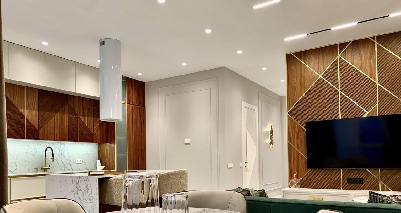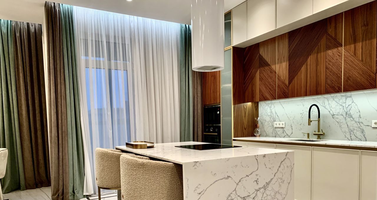 • Просторная гостиная, совмещённая с кухней, оснащены новейшей бытовой техникой ведущих брендов