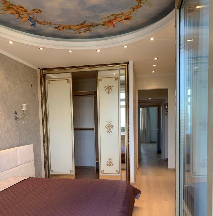 Спальня 1: Изолированная, с лоджией. Меблирована (кровать, прикроватные тумбы), большая гардеробная.