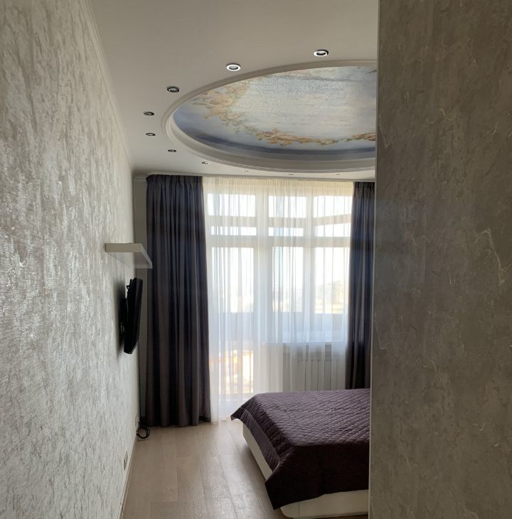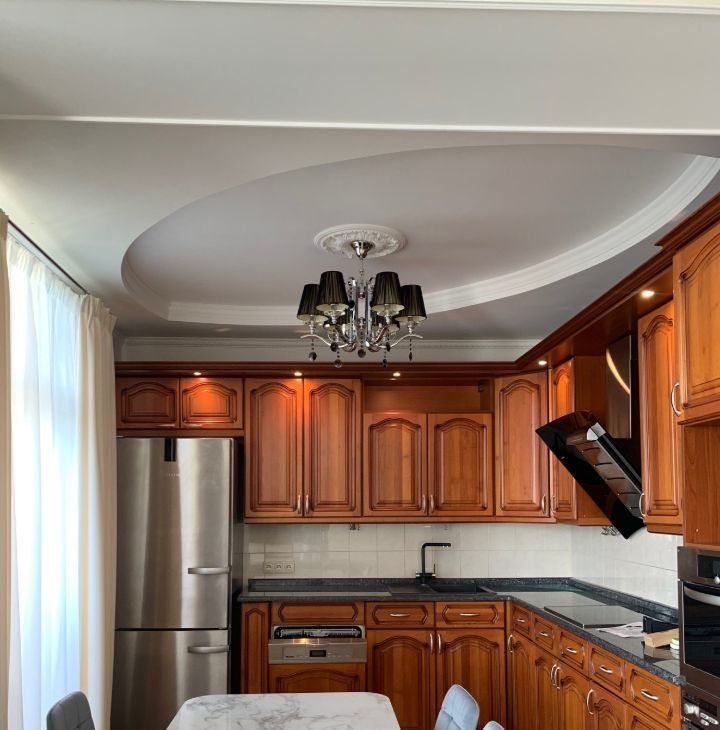 Кухня-гостиная: Объединенная, с выходом на лоджию. Полностью укомплектована встроенной техникой: холодильник, посудомоечная машина, духовой шкаф, варочная панель. Есть телевизор.