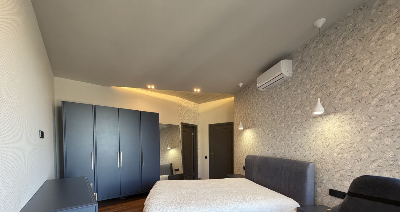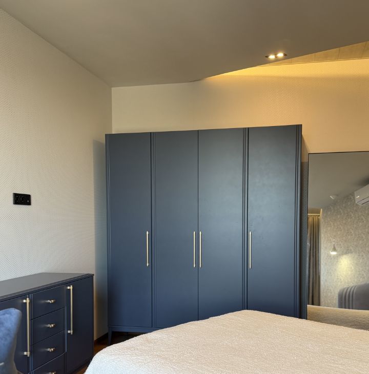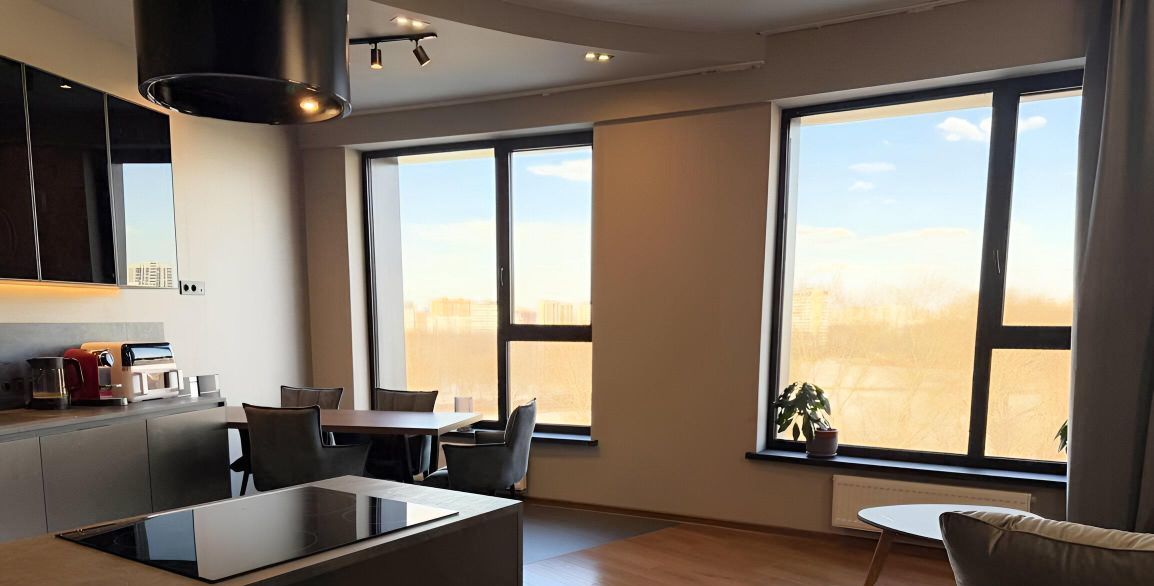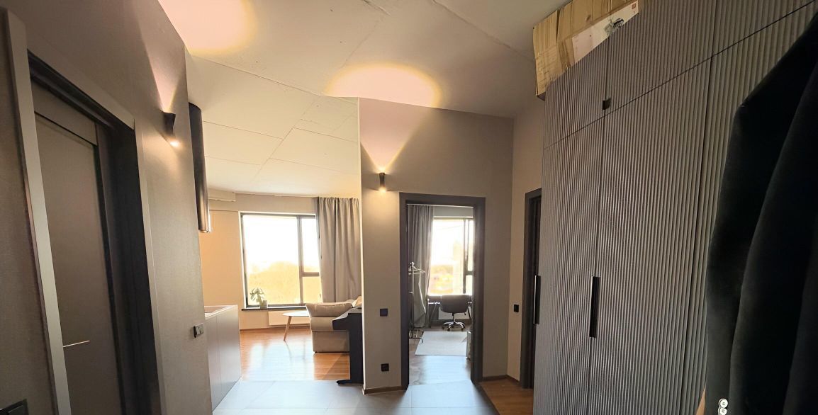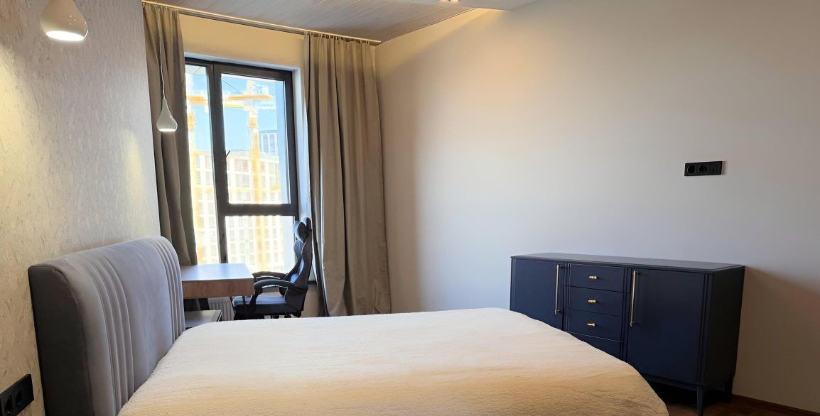 Квартира с дизайнерским ремонтом и продуманной планировкой. Кухня-гостиная, спальня-кабинет, мастер-спальня. В наличии вся необходимая мебель и современная техника: кондиционер, холодильник, посудомоечная машина, телевизор и стиральная машина. Высокие потолки и панорамные окна создают ощущение простора и света. В квартире есть два санузла: один совмещённый и один отдельный, в ванной комнате установлена душевая кабина.