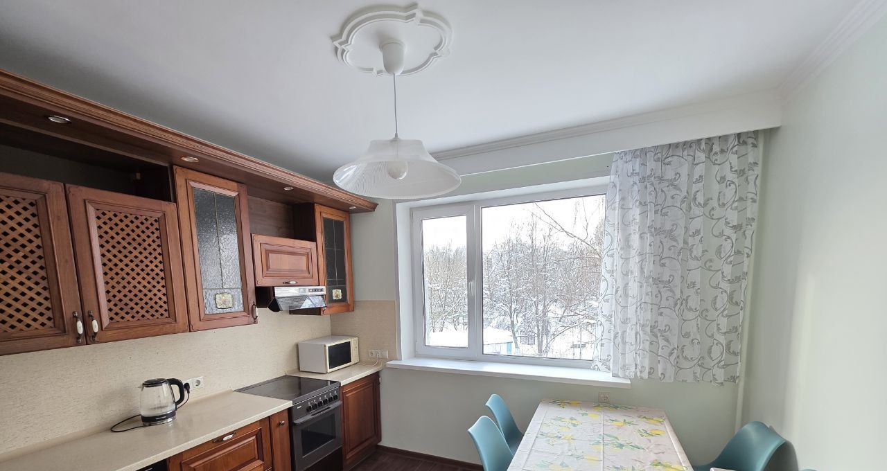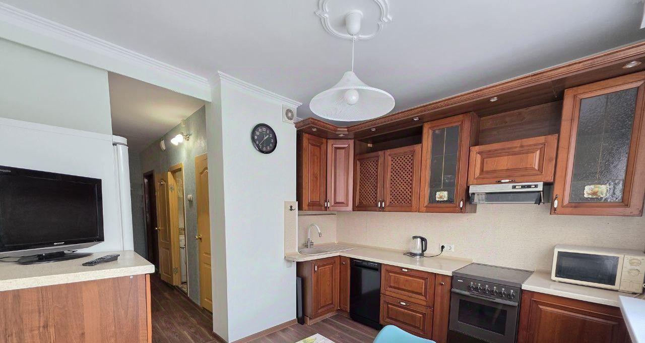 Кухня полностью оборудована необходимой мебелью и техникой. Имеется холодильник, втроенная ПММ, электроплита с духовкой, СВЧ-печь и телевизор.