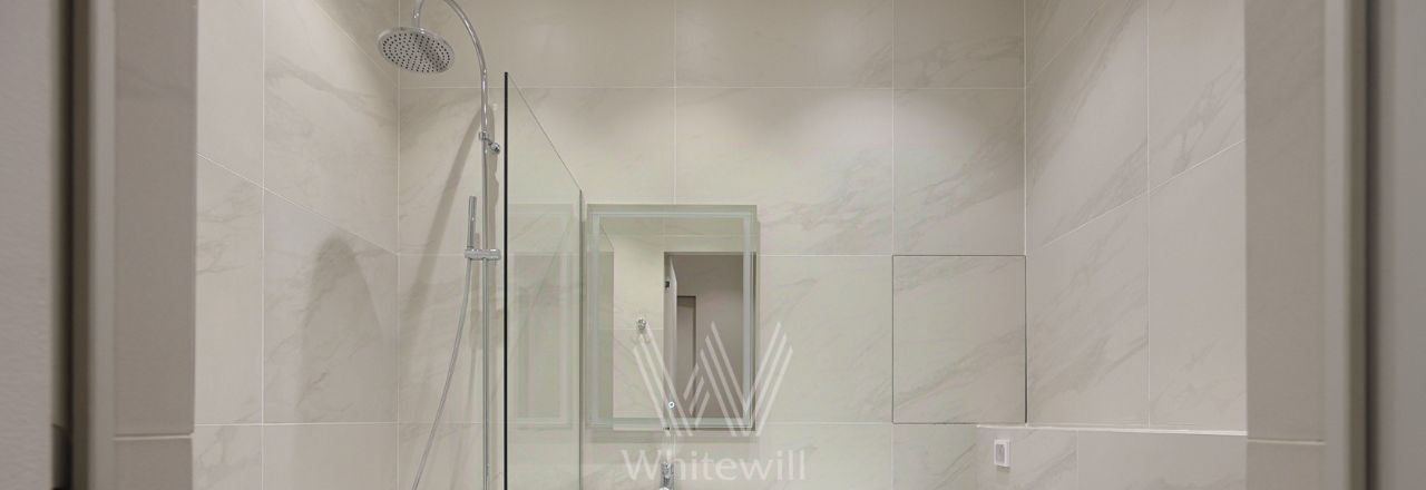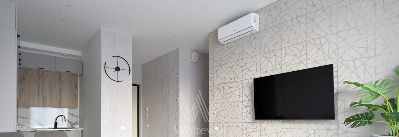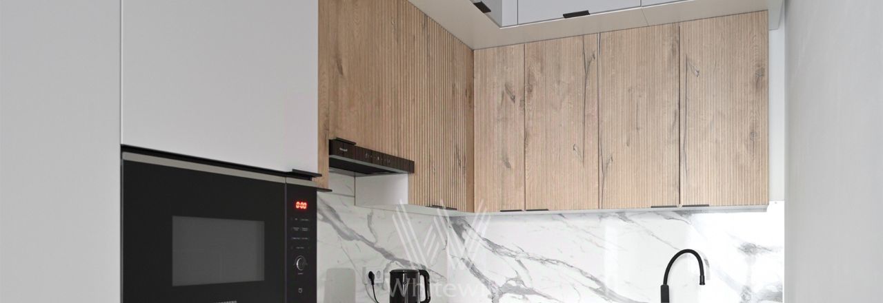 Выполнена дизайнерская отделка в светлых лаконичных тонах. В оформлении использованы фактуры мрамора и дерева. Установлена индивидуальная система кондиционирования. Квартира полностью меблирована и укомплектована бытовой техникой Kuppersberg и Weissgauff.