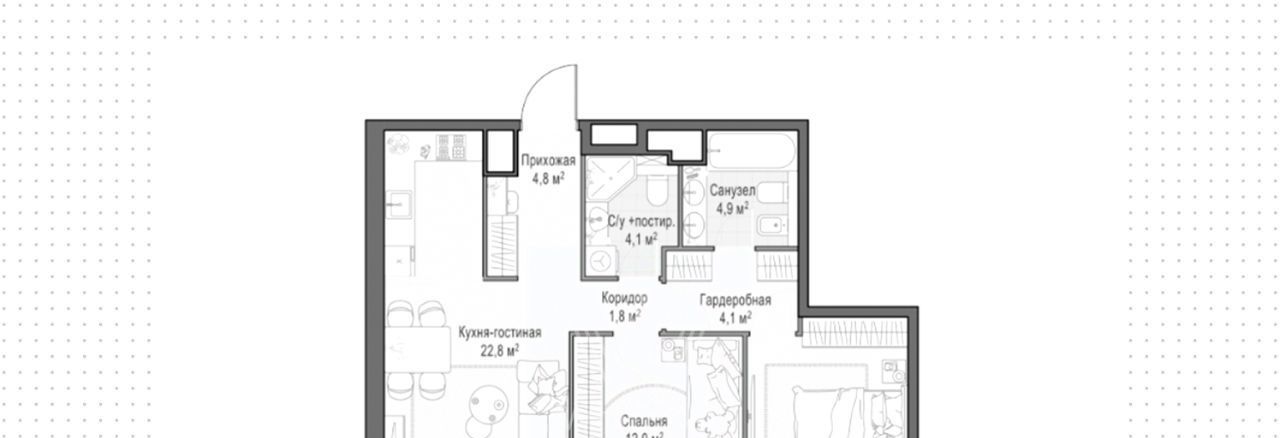 Планировка включает кухню-гостиную с обеденной зоной, мастер-спальню с собственной ванной комнатой, вторую спальню, санузел с постирочной зоной и холл. Дополнительно предусмотрено много мест для хранения вещей. Благодаря широкоформатному остеклению пространство наполнено естественным светом и теплом, открываются виды на проспект Генерала Дорохова и Матвеевский лес.