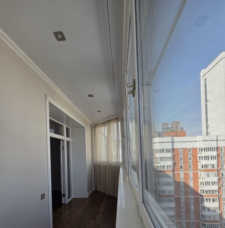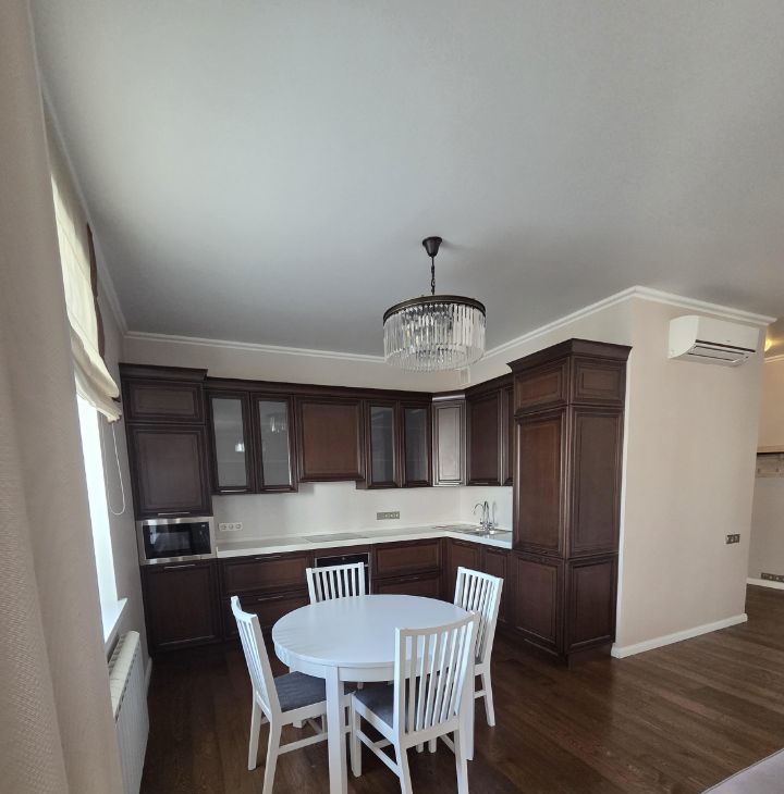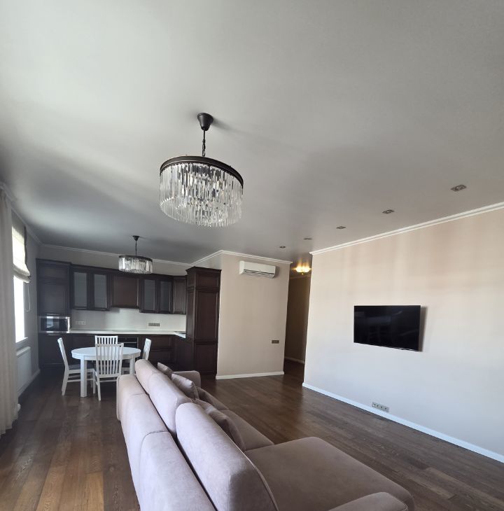 Две отдельные спальни, большая светлая кухня-гостиная с лоджией, два санузла, две гардеробные комнаты, много места для хранения, высокие потолки.