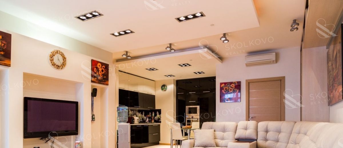 Светлую кухню, которая плавно переходит в гостиную с выходом на балкон, идеально подходящую для вечера с друзьями.