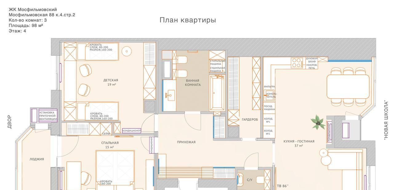 7.Функциональная планировка и удобное расположение: большое внимание уделено рациональному проектированию пространства с множеством мест хранения; квартира расположена на удалении от шумной ул.Мосфильмовская, окна детской и спальной - во двор, окна кухни-гостиной на Новую школу.