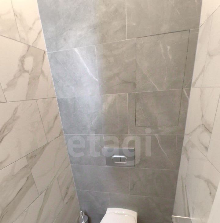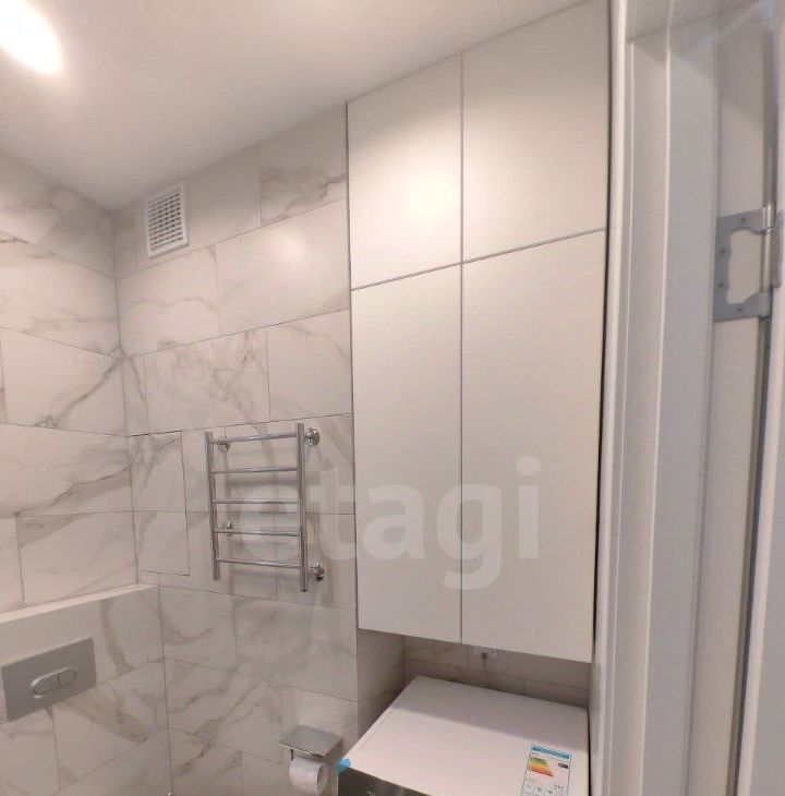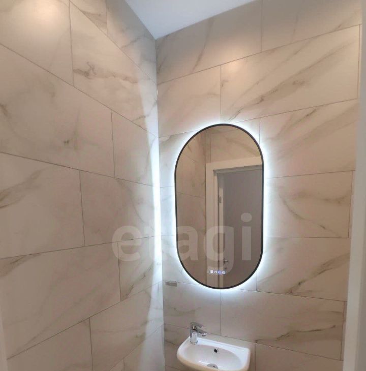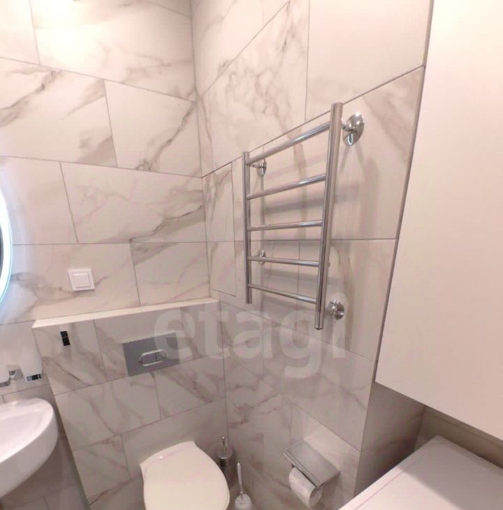 Первый санузел с ванной, раковиной и стиральной машиной, второй - гостевой санузел с раковиной.