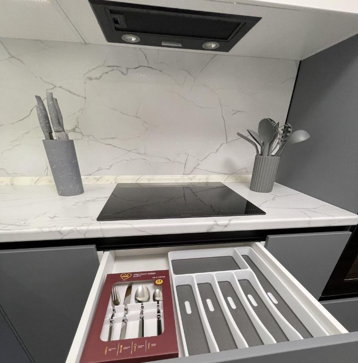 Кухня-гостиная оснащена всей необходимой техникой: холодильником, плитой микроволновой печью, посудомоечной машиной, вытяжкой, полный набор новой посуды, раскладной диван, кондиционер, обеденный стол со стульями.