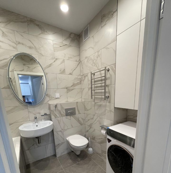 Первый санузел оформлена в светлых тонах и оборудована раковиной, ванной и стиральной машиной. Второй санузел - гостевой, оборудован раковиной и зеркалом.