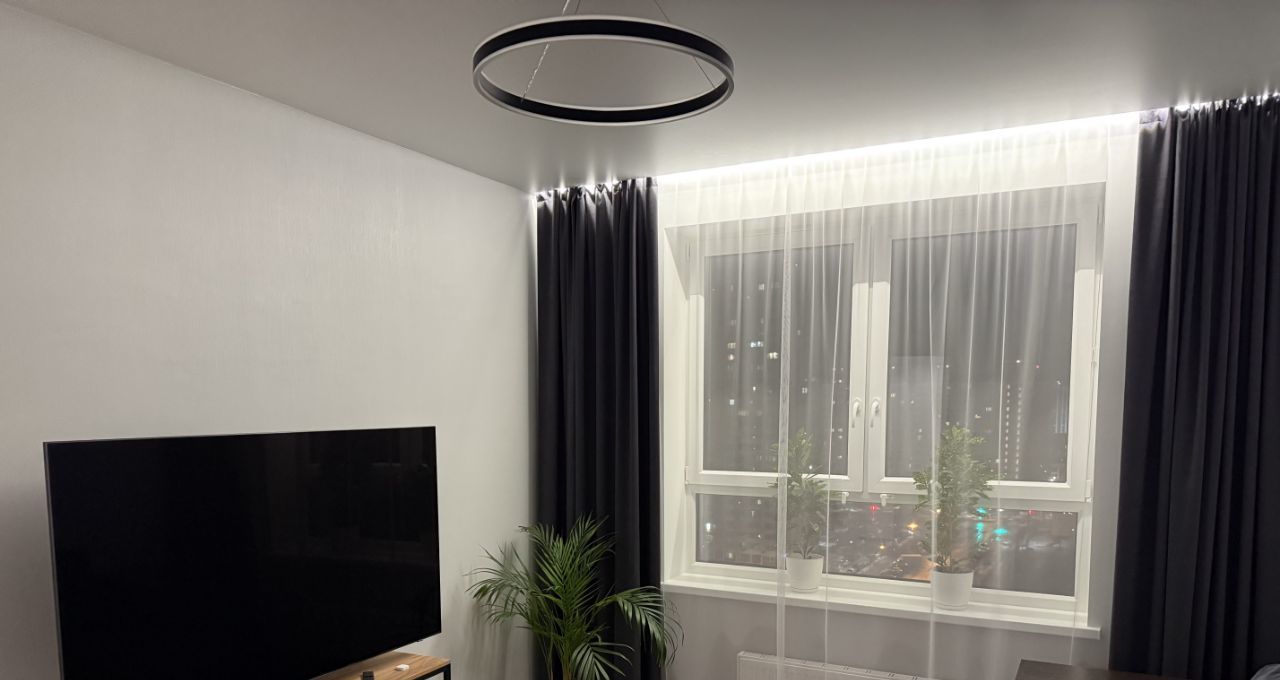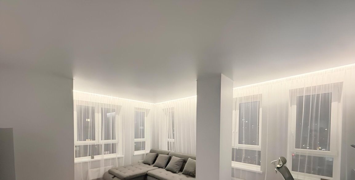 По всей квартире установлены скрытые карнизы с декоративной подсветкой, создающие дополнительный уют и современную атмосферу.