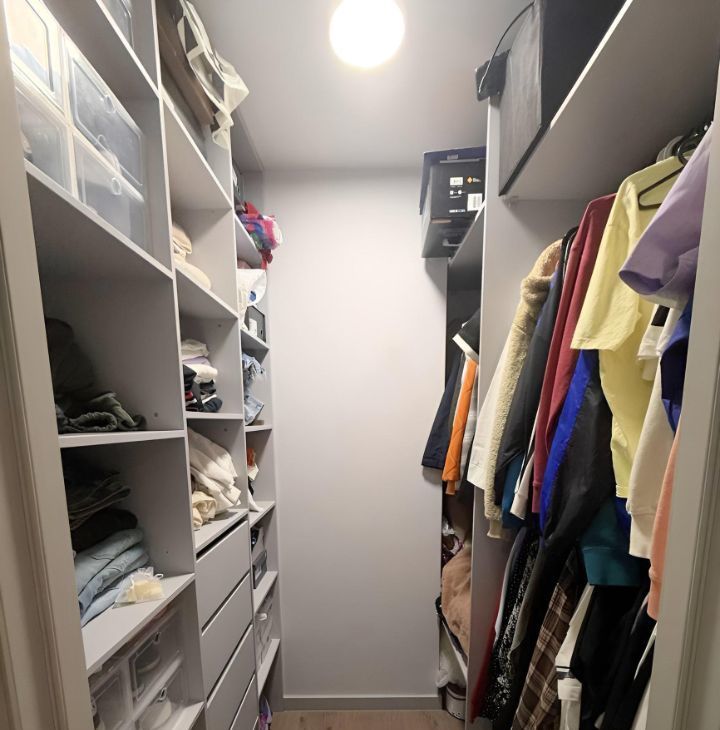 В квартире предусмотрена просторная гардеробная комната, позволяющая удобно организовать хранение вещей и освободить жилые комнаты от лишних шкафов.