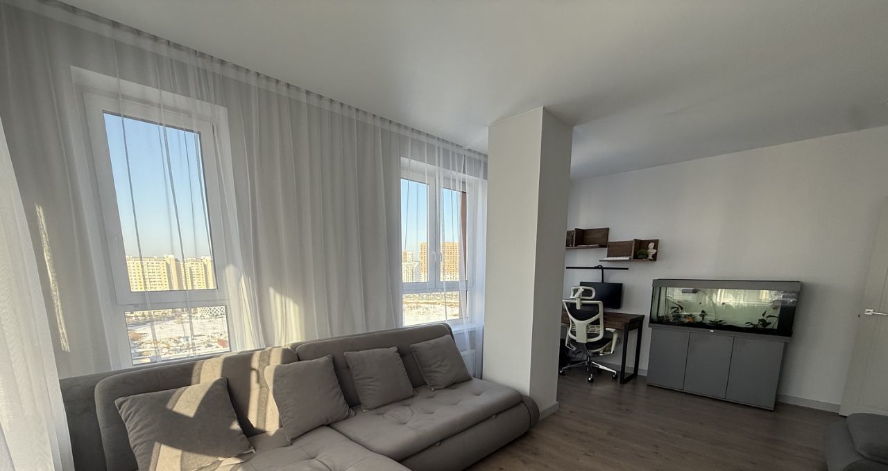 Главная зона квартиры — просторная кухня-гостиная, где объединены кухня, столовая и зона отдыха. Кухонный гарнитур выполнен в современном стиле, установлена каменная столешница и подсветка рабочей зоны. Большое количество окон наполняет помещение естественным светом и создаёт ощущение простора.
