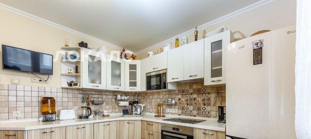 В квартире сделан евроремонт, есть вся необходимая мебель и бытовая техника: стиральная и посудомоечная машины, духовой шкаф, плита, холодильник — заезжай и живи.