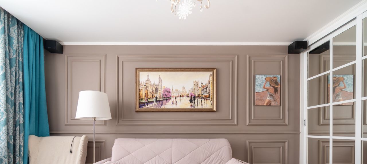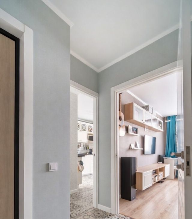Гостиная с гардеробной: Пространство для отдыха, в котором остаются: вместительный гардероб, удобный диван с ортопедическим матрасом бренда Андерсон, кондиционер, настенный тв модуль, стол и стул.