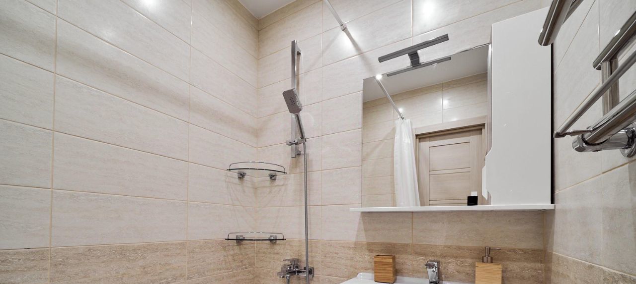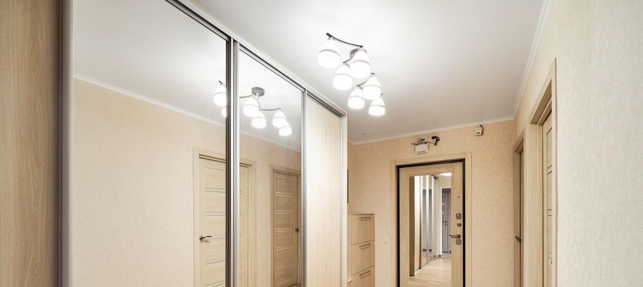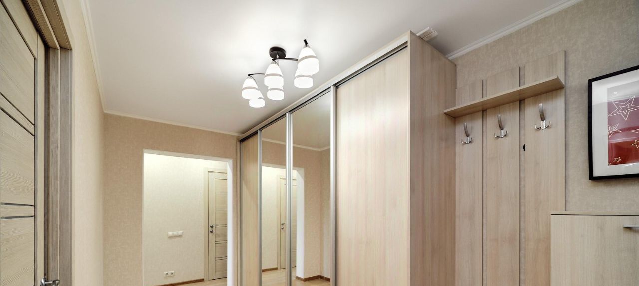 Системы хранения: В холле установлен полноразмерный зеркальный шкаф-купе, который полностью решает вопрос хранения личных вещей, сохраняя визуальную чистоту и порядок в жилых зонах.
