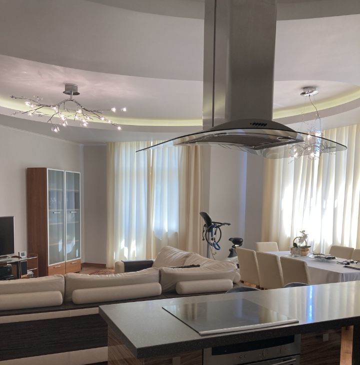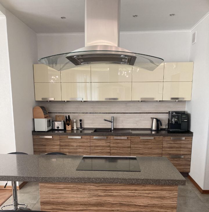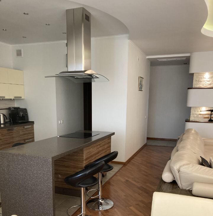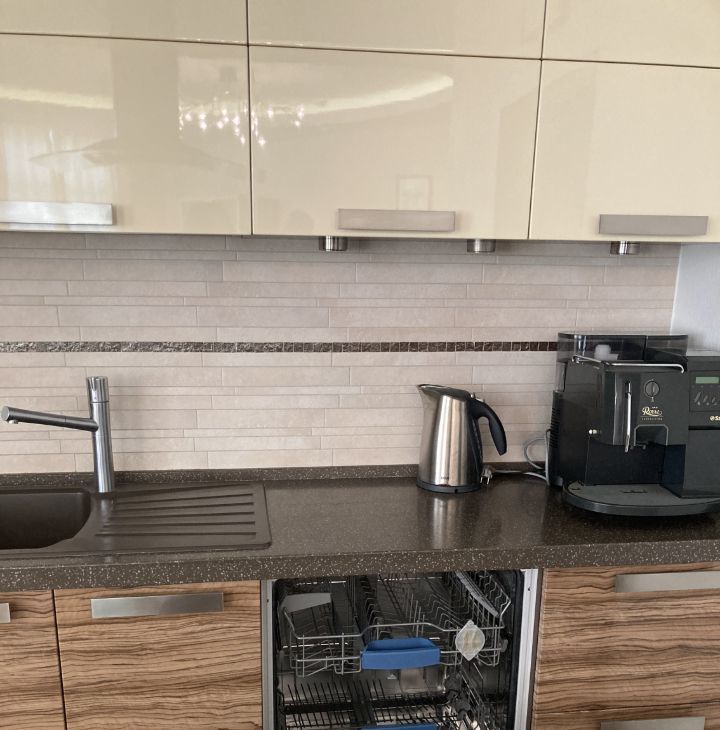 Квартира укомплектована всей необходимой техникой и мебелью, в том числе: холодильник, встроенный духовой шкаф и свч печь, посудомоечная машина, варочная панель, телевизор, стиральная машина, два дивана, столы, стулья, гладильная доска и т.д.