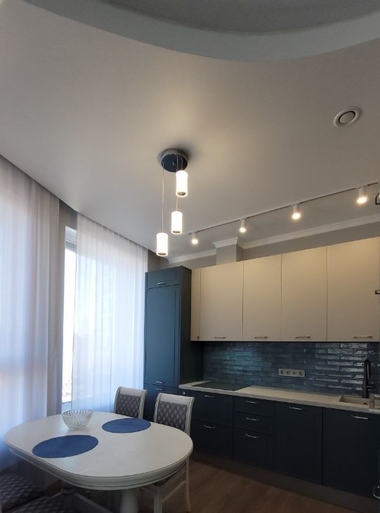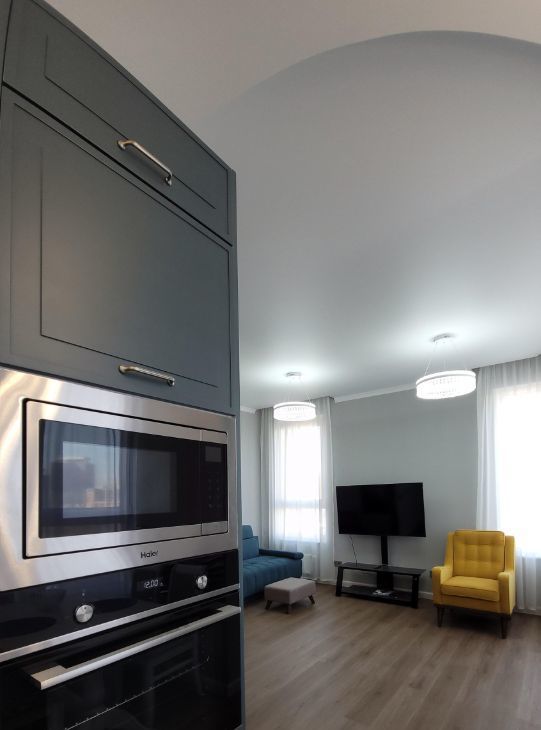Просторная кухня-гостинная с шикарной кухней и техникой.
