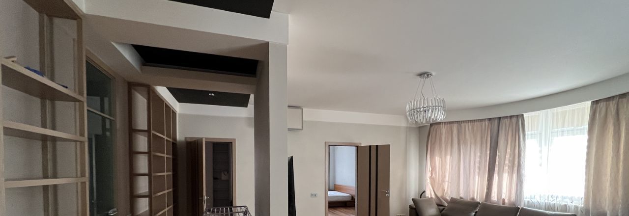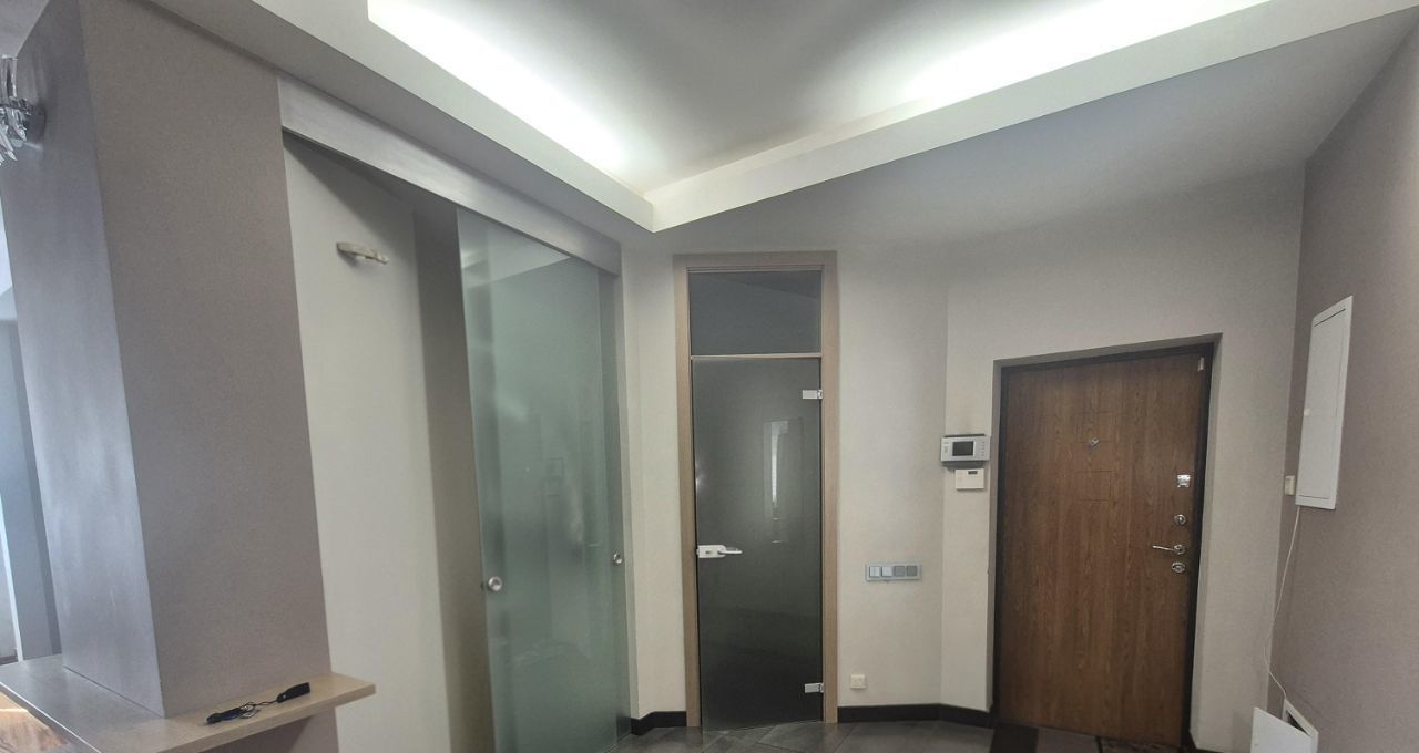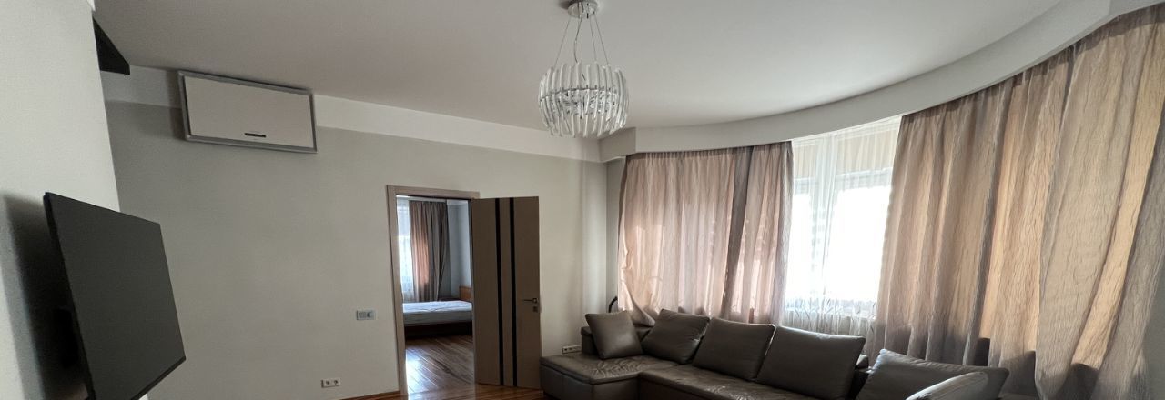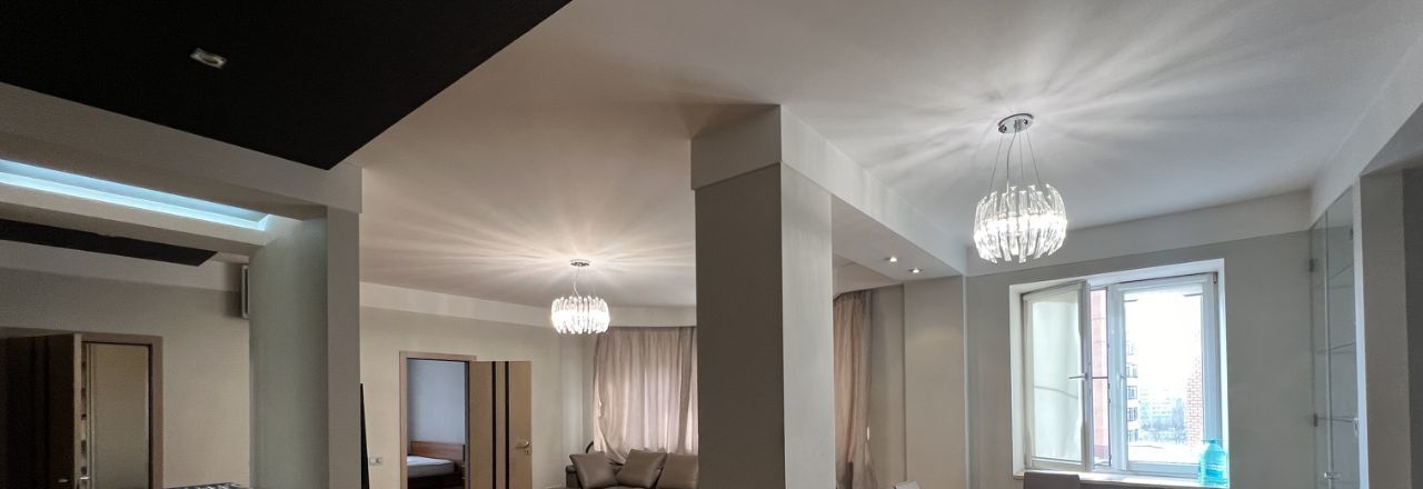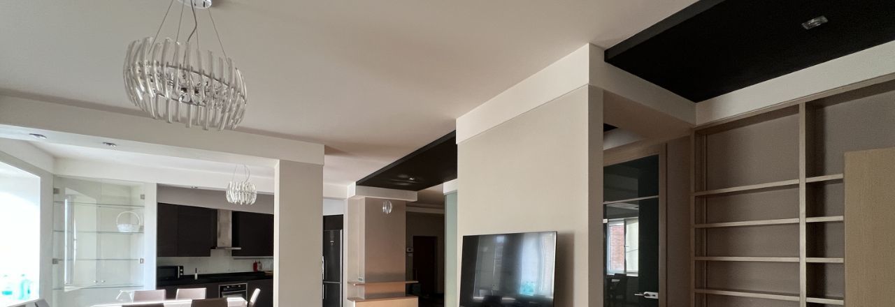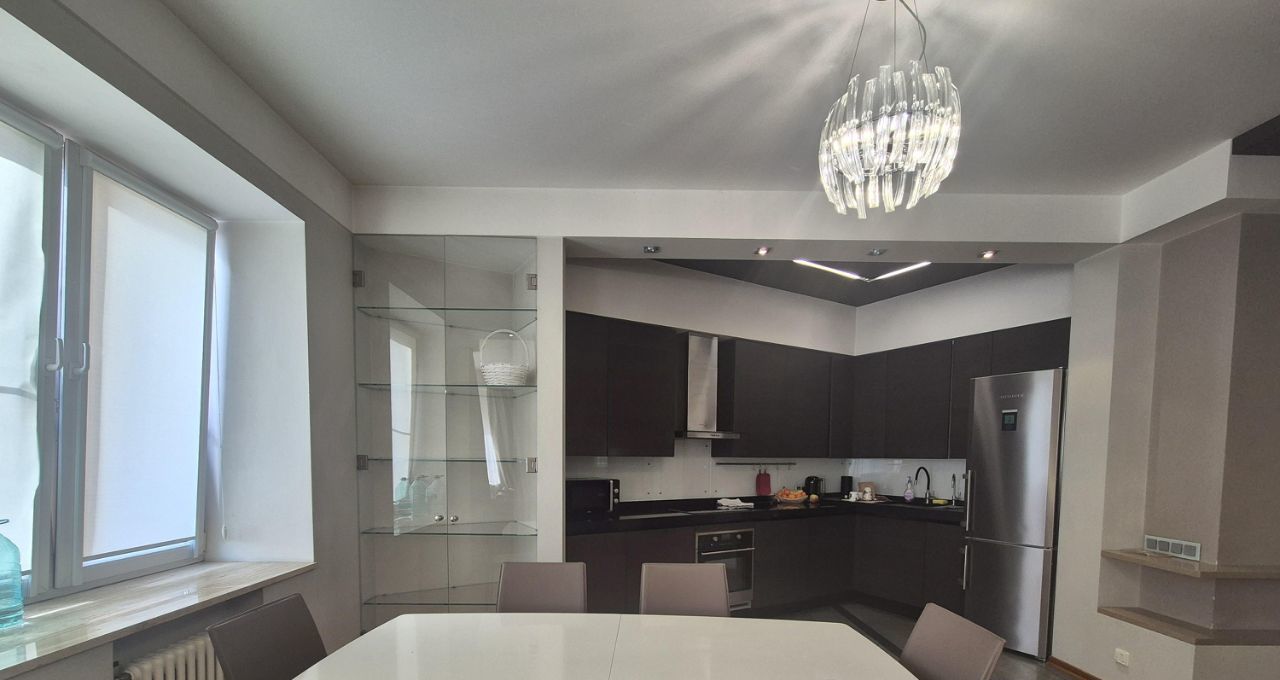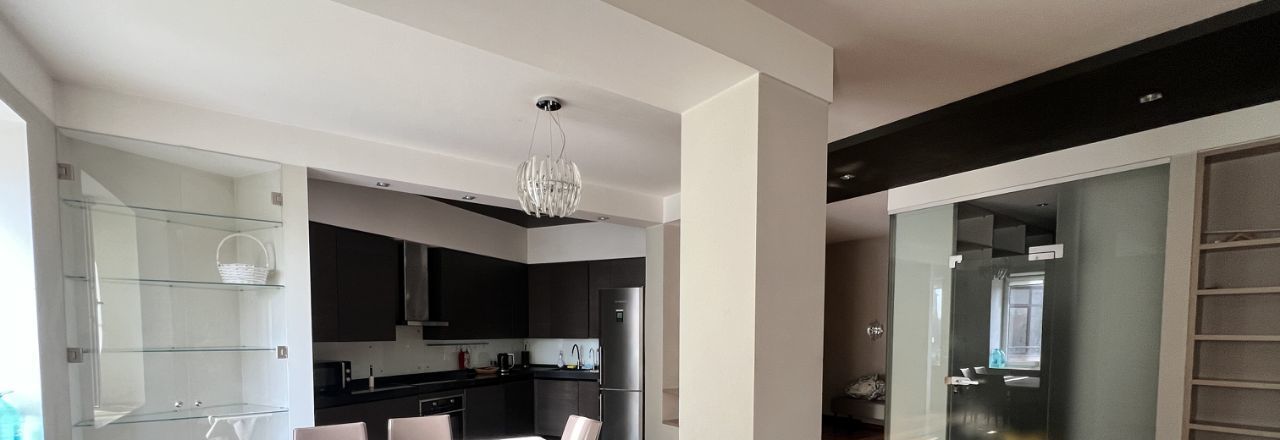 Квартира с огромной кухней и гостиной в одном пространстве, двумя изолированными спальнями, двумя санузлами, большой гардеробной комнатой и застеклённой лоджией. Отделка квартиры выполнена в современном стиле, мебель и техника от европейских производителей. Высота потолков — 3,3 м. В квартире есть вся необходимая мебель и бытовая техника для комфортного проживания семьи.