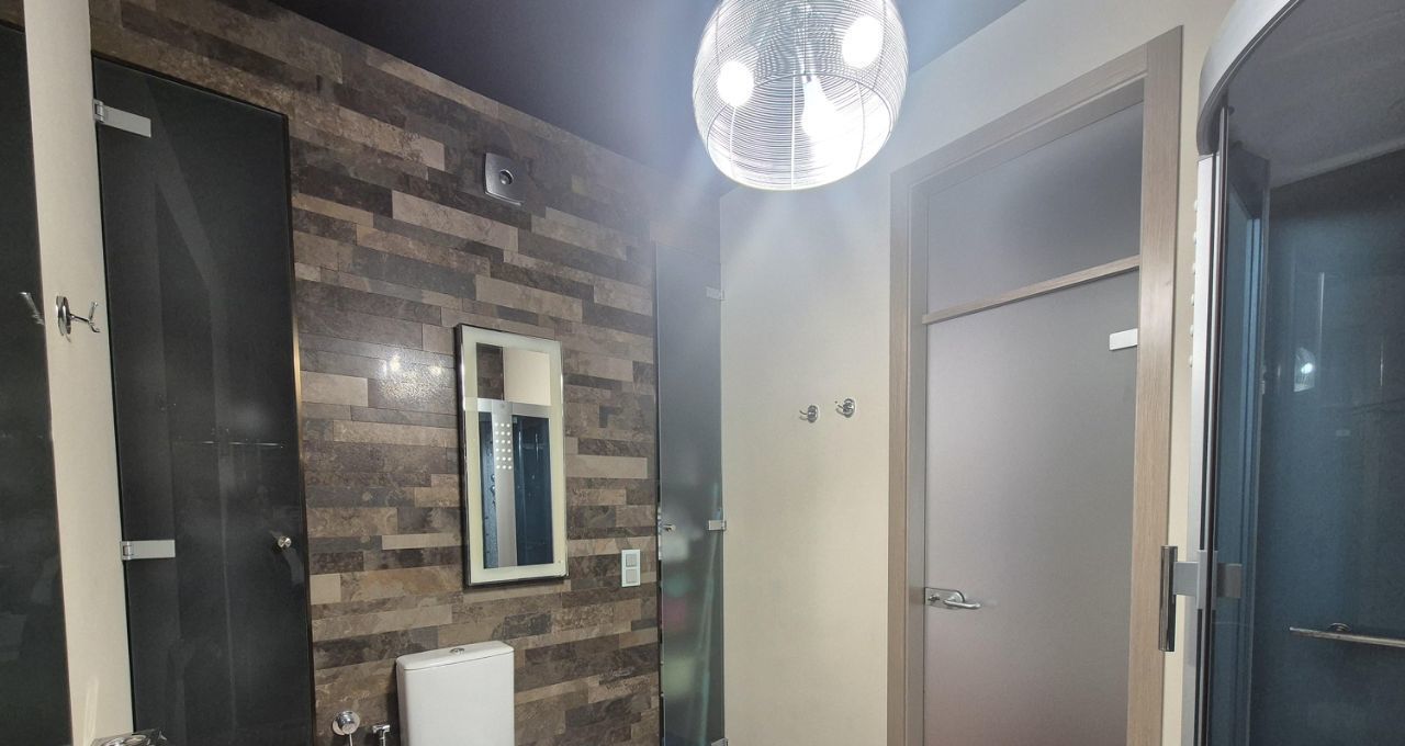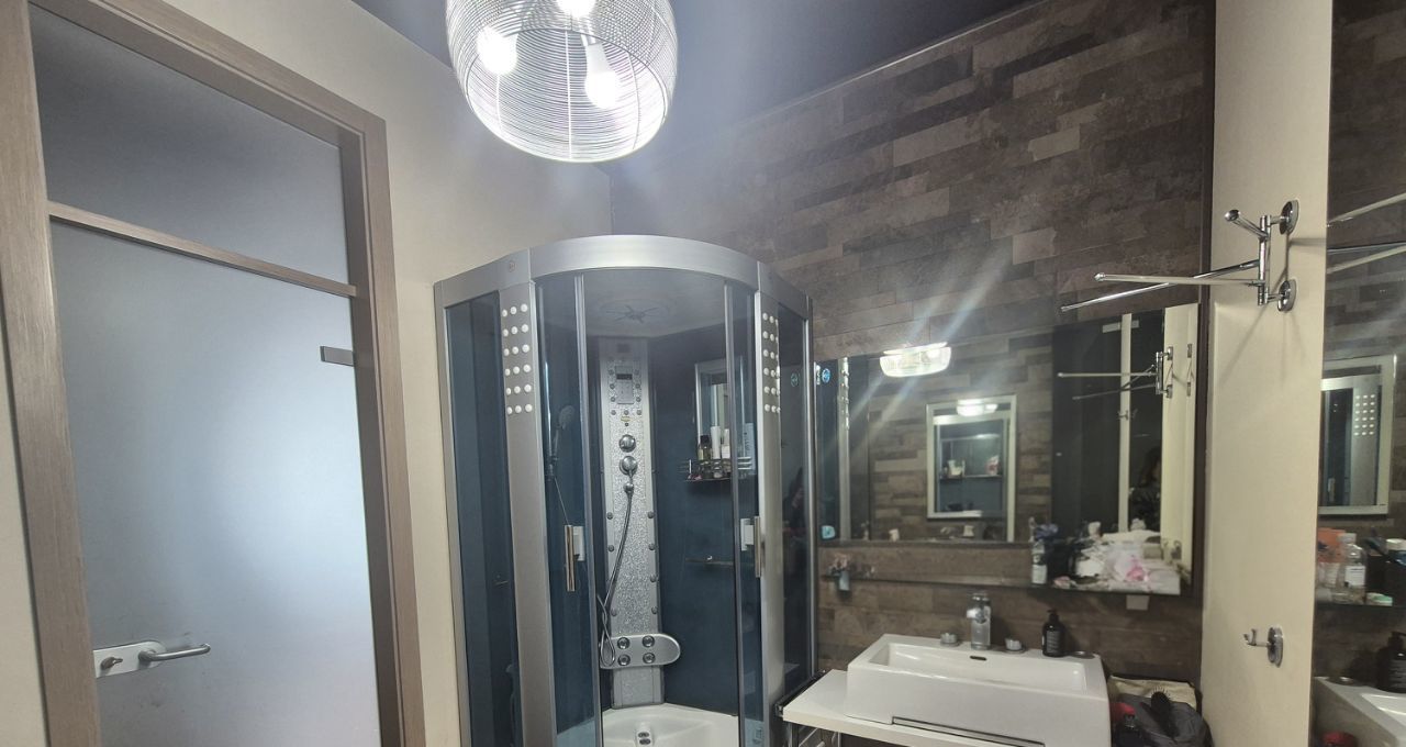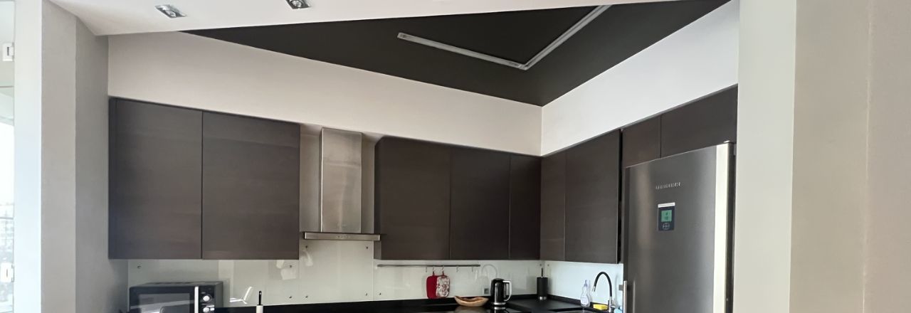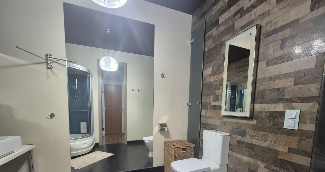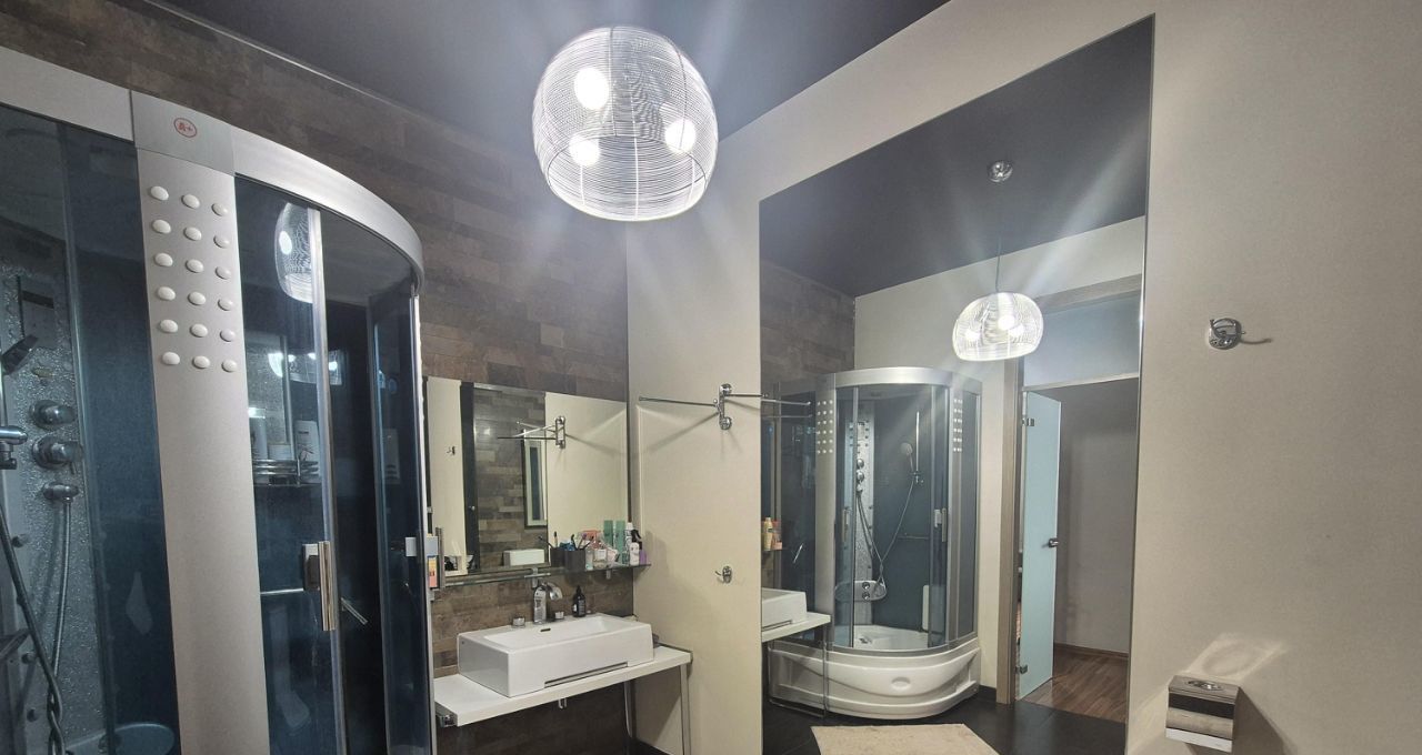 Квартира с огромной кухней и гостиной в одном пространстве, двумя изолированными спальнями, двумя санузлами, большой гардеробной комнатой и застеклённой лоджией. Отделка квартиры выполнена в современном стиле, мебель и техника от европейских производителей. Высота потолков — 3,3 м. В квартире есть вся необходимая мебель и бытовая техника для комфортного проживания семьи.