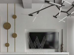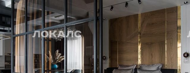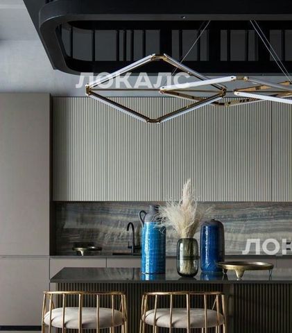 Эксклюзивный апартамент с авторским дизайном в современном стиле с элементами ар-деко. Пространство оформлено в глубокой тёмной палитре с контрастными позолоченными акцентами, создающими атмосферу роскоши и уюта.