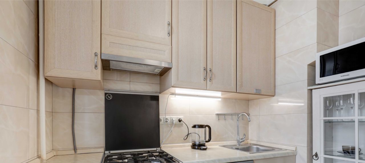 Встроенный кухонный гарнитур, вся бытовая техника (стиральная и посудомоечные машины, холодильник, газовая плита с духовкой, вытяжка, микроволновая печь).