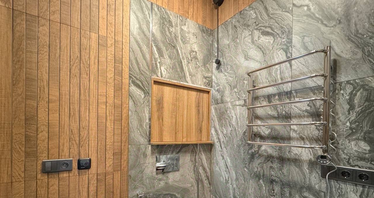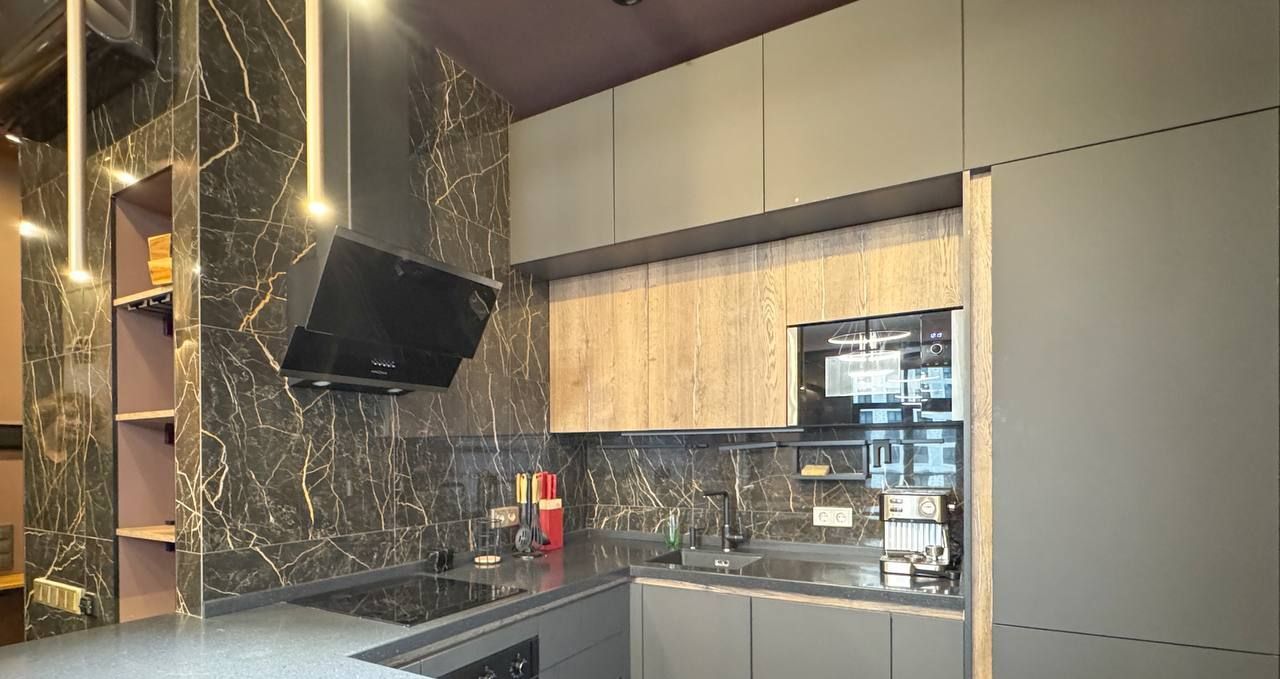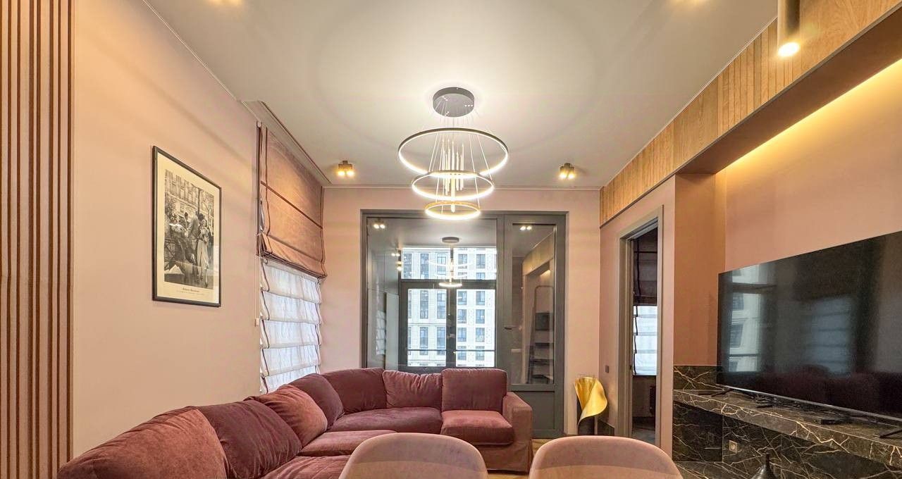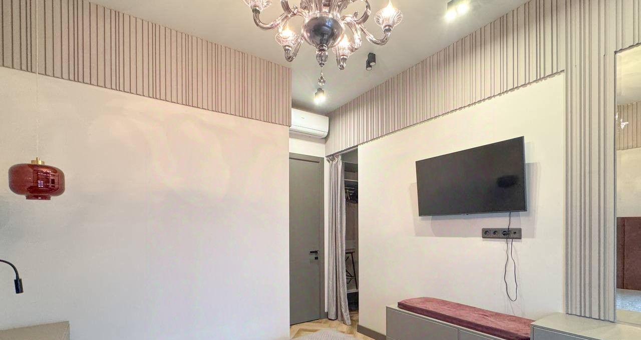 В квартире выполнен качественный дизайнерский в спокойной современной стилистике, установлена вся необходимая мебель и техника: холодильник, посудомоечная и стиральная машины, кондиционеры в каждой комнате, два телевизора, интернет, полный набор посуды. Продуманная система хранения с отдельной гардеробной позволяет поддерживать порядок без лишних шкафов в комнатах. Санузел совмещённый, оборудован современной душевой кабиной.