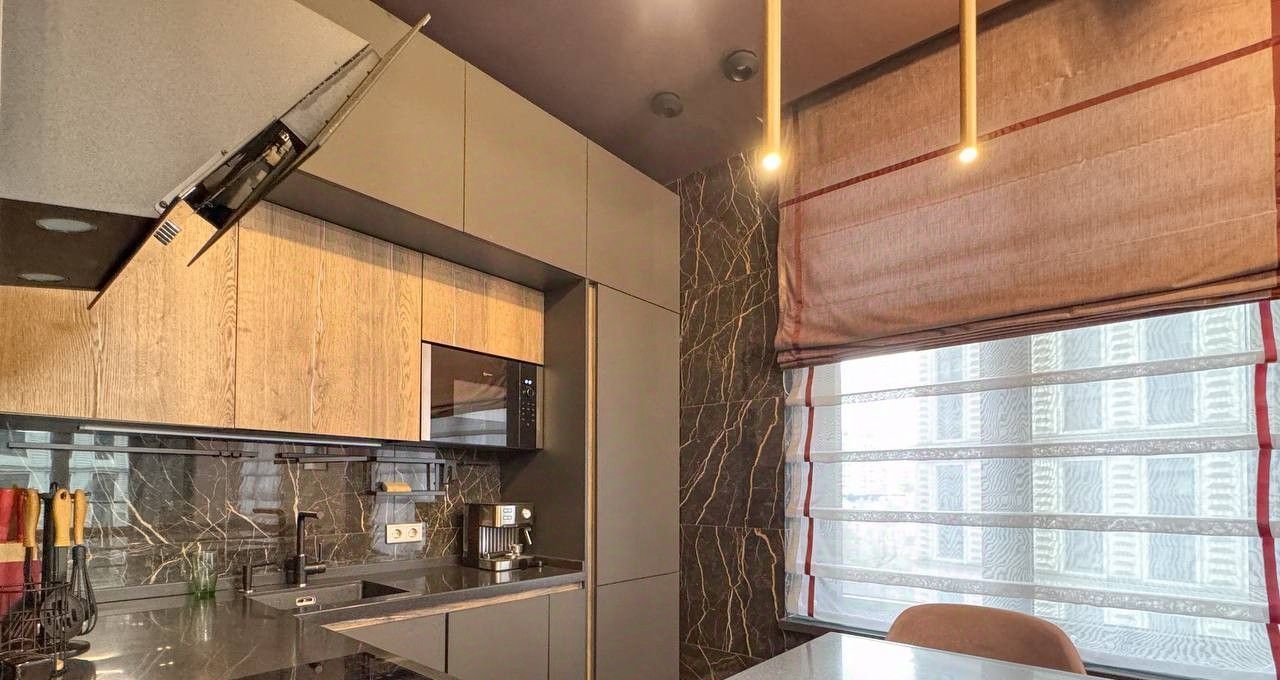 Сдаётся впервые стильная евротрёхкомнатная квартира в современном ЖК Серебряный фонтан. Просторная кухнягостиная площадью 23 м², две изолированные комнаты и отдельная гардеробная создают продуманное жилое пространство для комфортной жизни. Высокие потолки около 3,2 м и панорамные окна наполняют квартиру светом и визуально расширяют пространство.