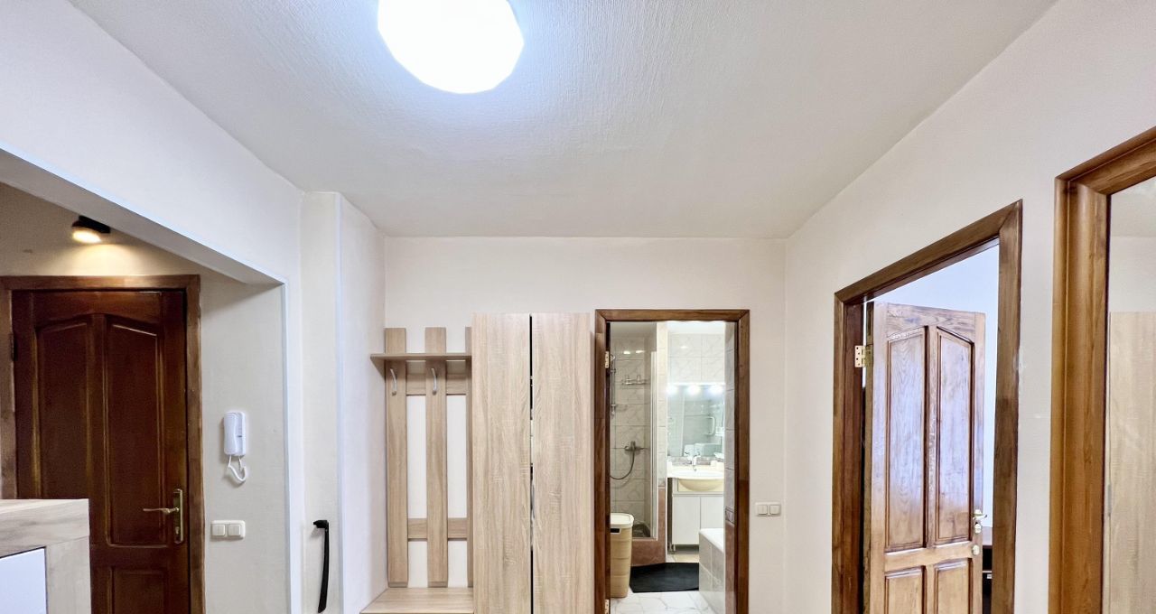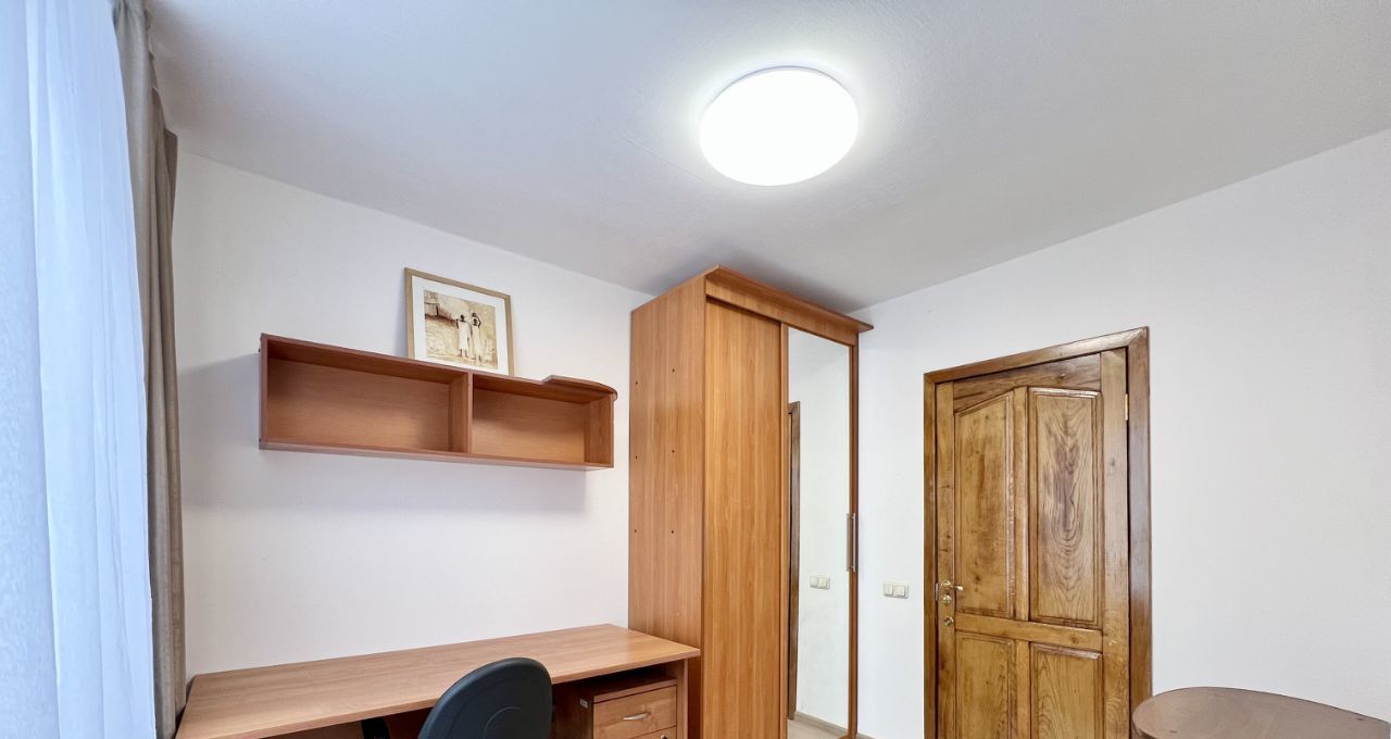 Просторный холл, три изолированные комнаты (18,16,15 кв.м.), кухню (13 кв.м.), просторный С/У (с ванной и душевой кабиной), вместительную гардеробную.
