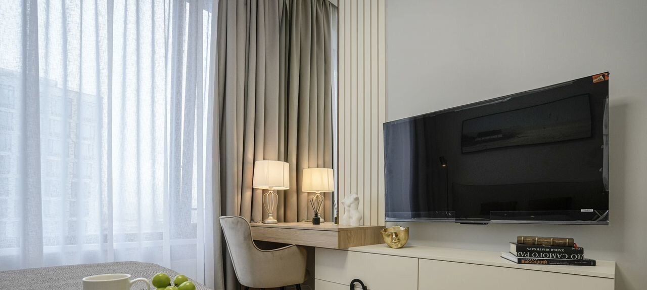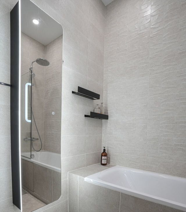 Квартира с дизайнерским ремонтом и полностью меблирована. В обстановку входит всё необходимое для комфортной жизни: кондиционер, холодильник, посудомоечная машина, телевизор и стиральная машина. На кухне и в комнате есть мебель, а в ванной комнате установлена ванна. Просторная планировка позволяет удобно расположиться в каждой из комнат. Современные коммуникации, такие как интернет и телефон, обеспечат вам удобство в повседневной жизни.