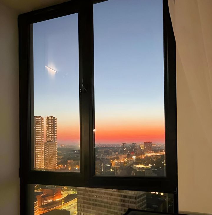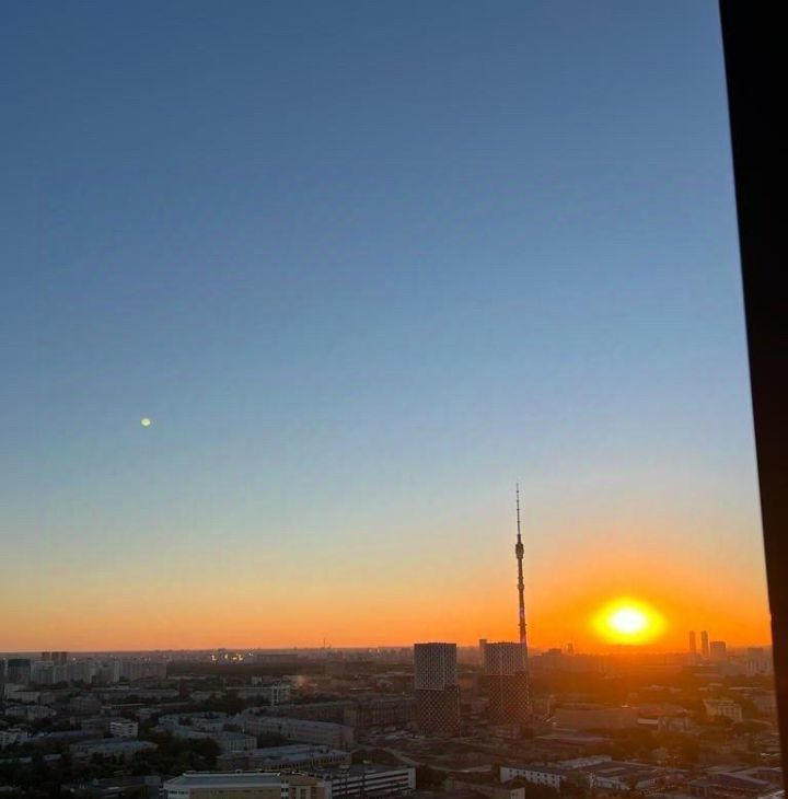 31 этаж: 3 окна прямого панорамного вида во весь рост, никакие постройки не загораживают вид, особенно летом можно просто сойти с ума от красоты закатов, которые идально видно прямо с дивана в гостинной и с кровати из спальни. А если близко подойти к окну, то справа видно ещё и прекрасные рассветы поднимающиеся над останкинской телебашней.