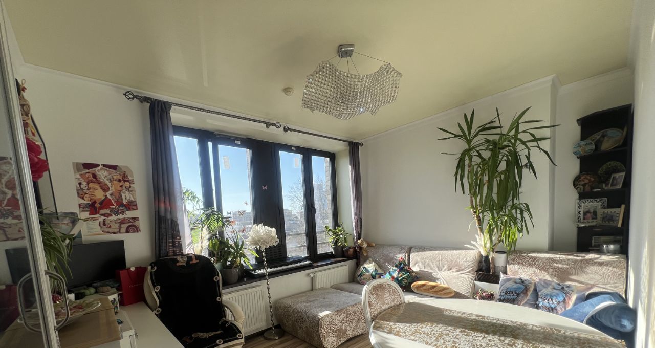 С большими окнами (высота — 1,8 м, подоконник — 40 см) с видом на две стороны: 4 окна выходят на Москва-Сити и детскую площадку (юго-запад), 4 окна — во двор с видом на закат (северо-запад).