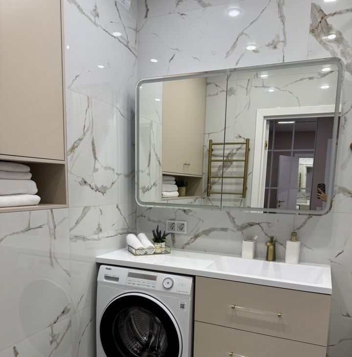 посудомоечная машина, стиральная машина инверторная (бесшумная), телевизор 60 дюймов, большой холодильник, плита - индукция, есть также пылесос, кондиционер, фильтрация воды питьевой с ОСМОСОМ (аквафор), утюг, гладильная доска, также установлены заказные шторы Блэкаут (для любителей поспать в темноте)+есть система от протечки воды, при появлении воды в мокрых зонах (на полу) датчики протечки перекрывают воду во всей квартире, во избежании потопа.
