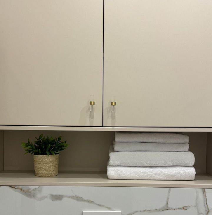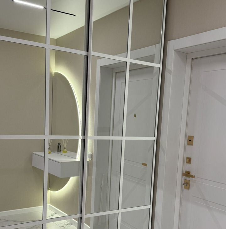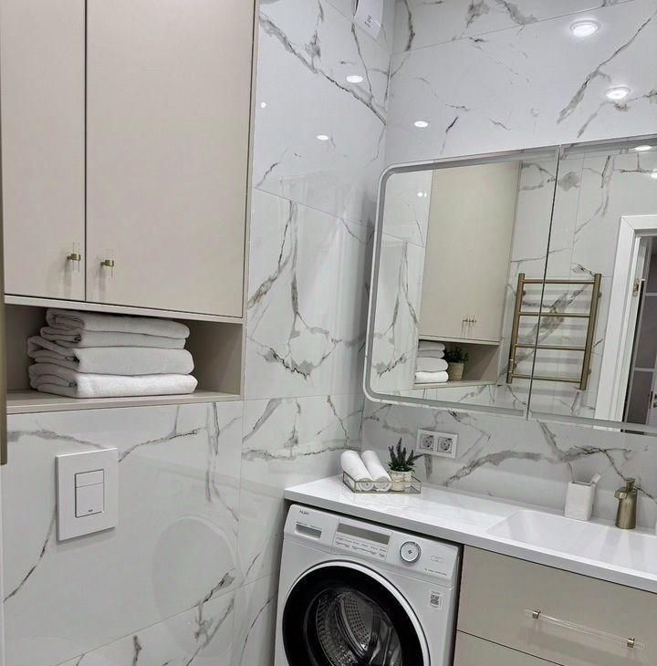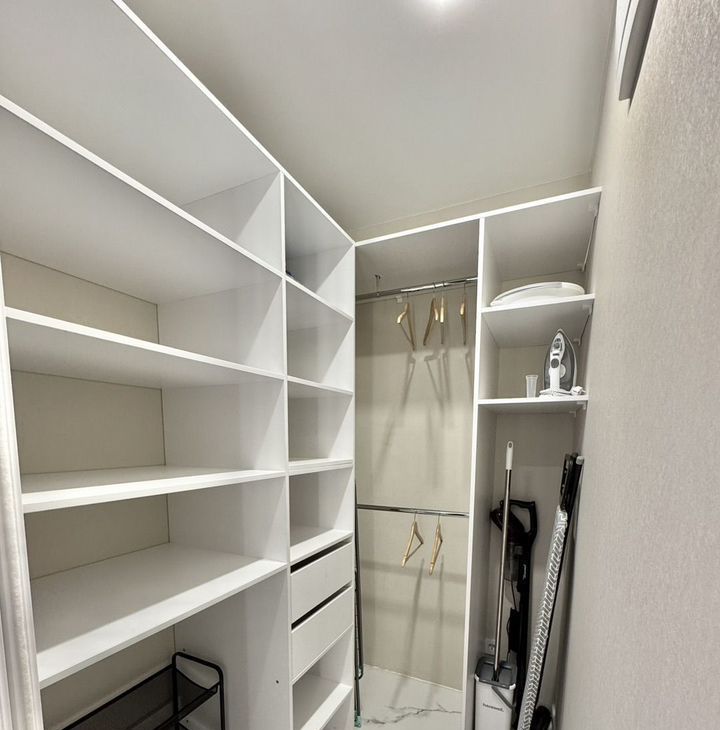 В гардеробной комнате имеется мебель для хранения, отсек с розеткой для вертикального пылесоса+ коммуникации для сушильной машины.