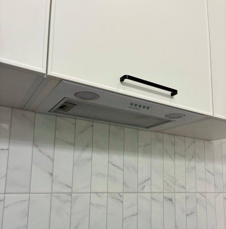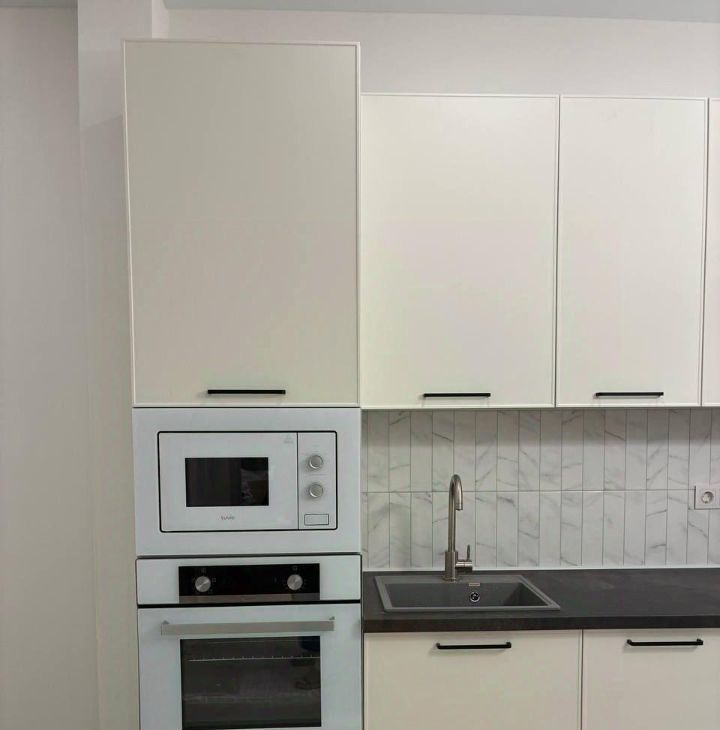 Бытовая техника: холодильник, плита, духовой шкаф, вытяжка, микроволновка, полотенцесушитель, стиральная машина, кондиционер, телевизор, посудомоечная машина.
