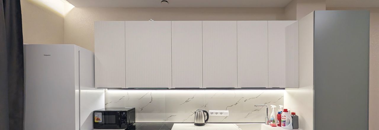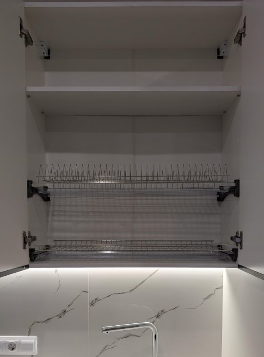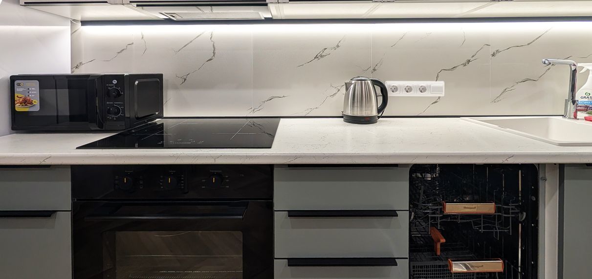 - вместительный кухонный гарнитур с высоким пеналом