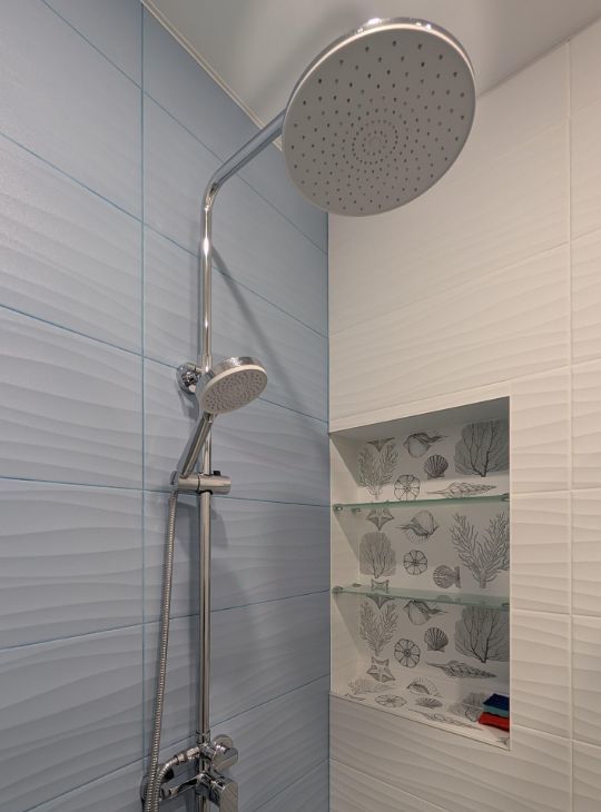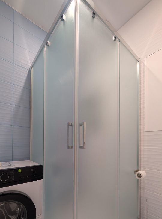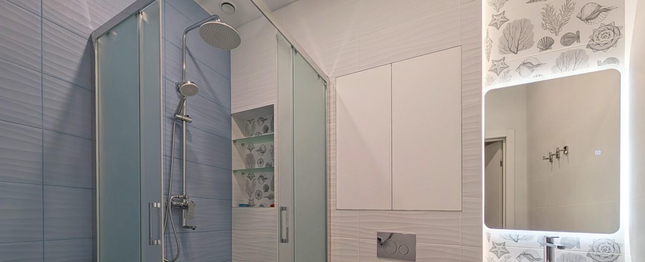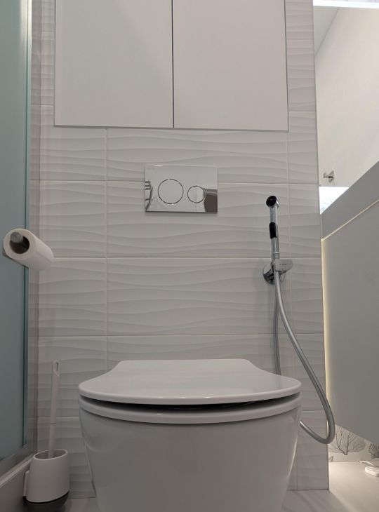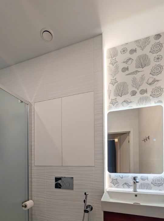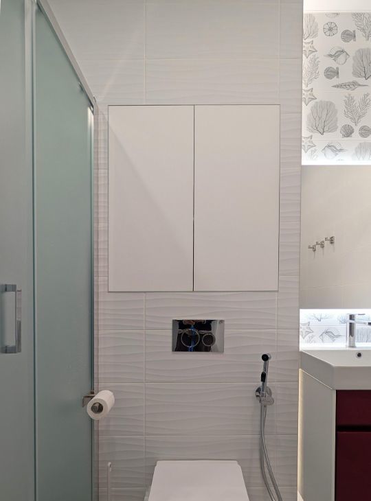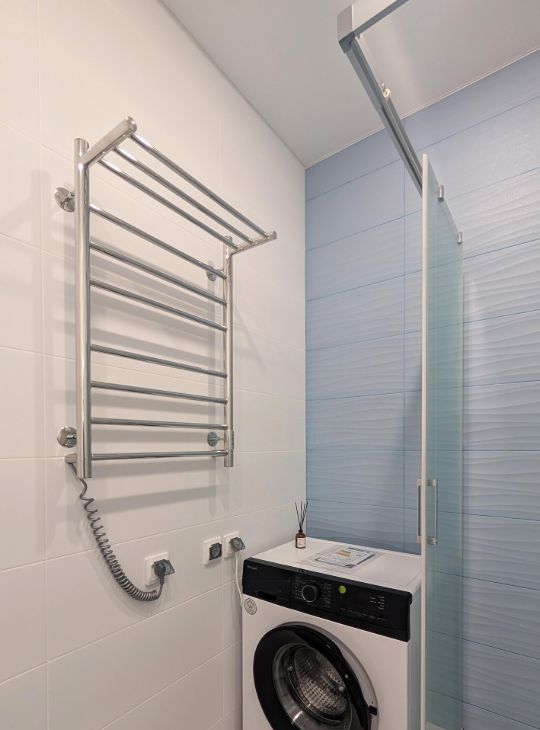 Душевая кабина, раковина, зеркало с подогревом и подсветкой, стиральная машины, инсталляция, электрический полотенцесушитель, проточный водонагреватель, защита от протечек