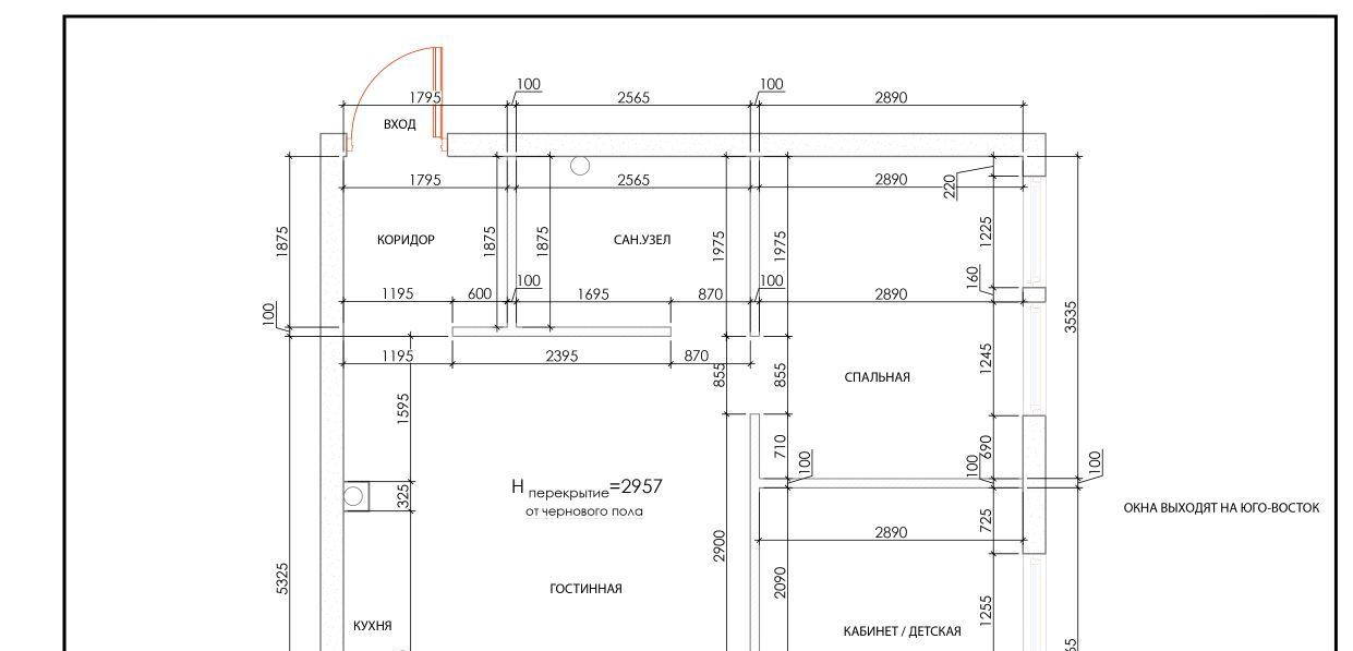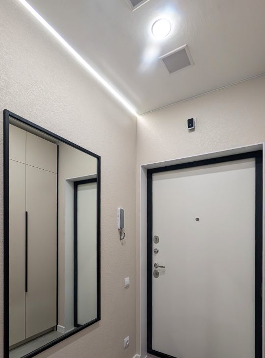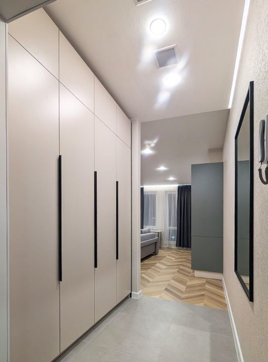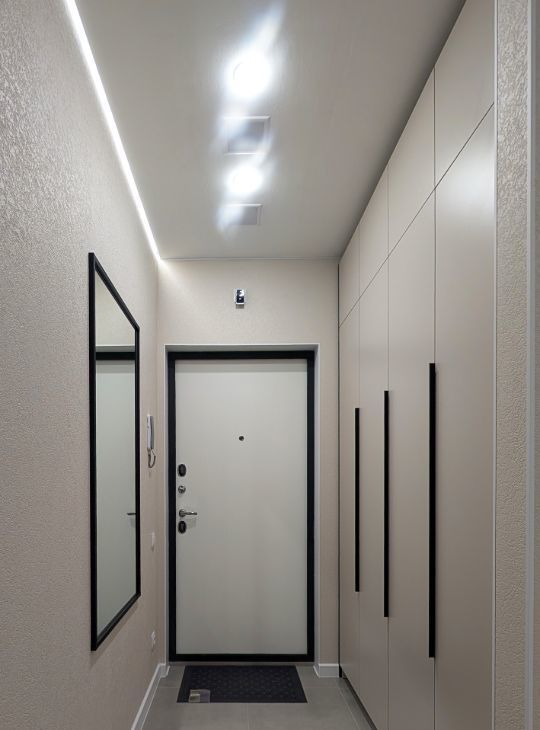 В коридоре установлен вместительный встроенный шкаф, зеркало, лоток для мокрой обуви.