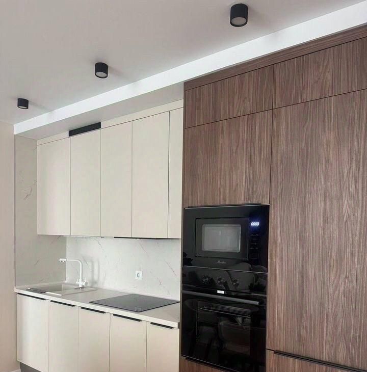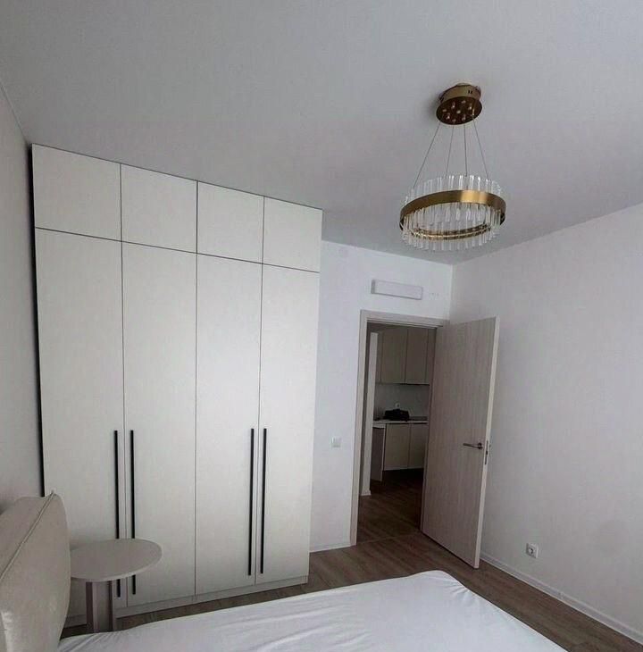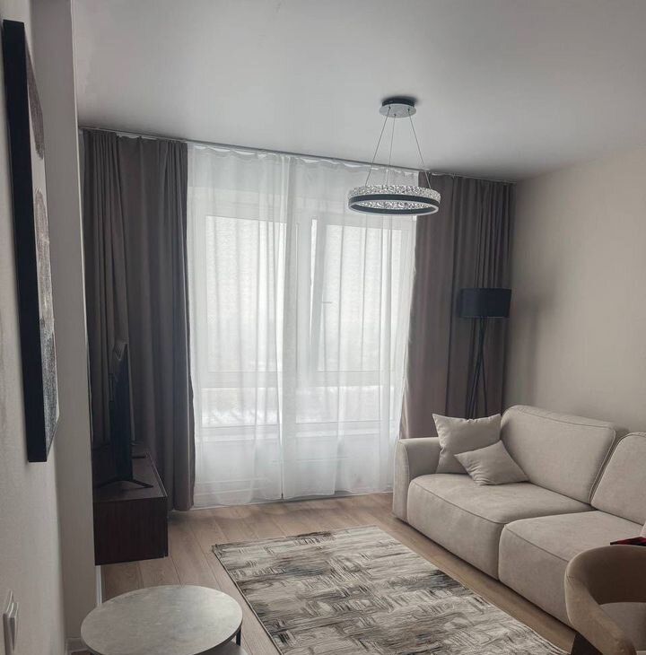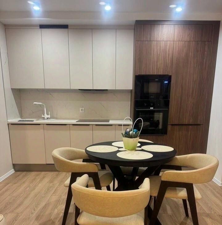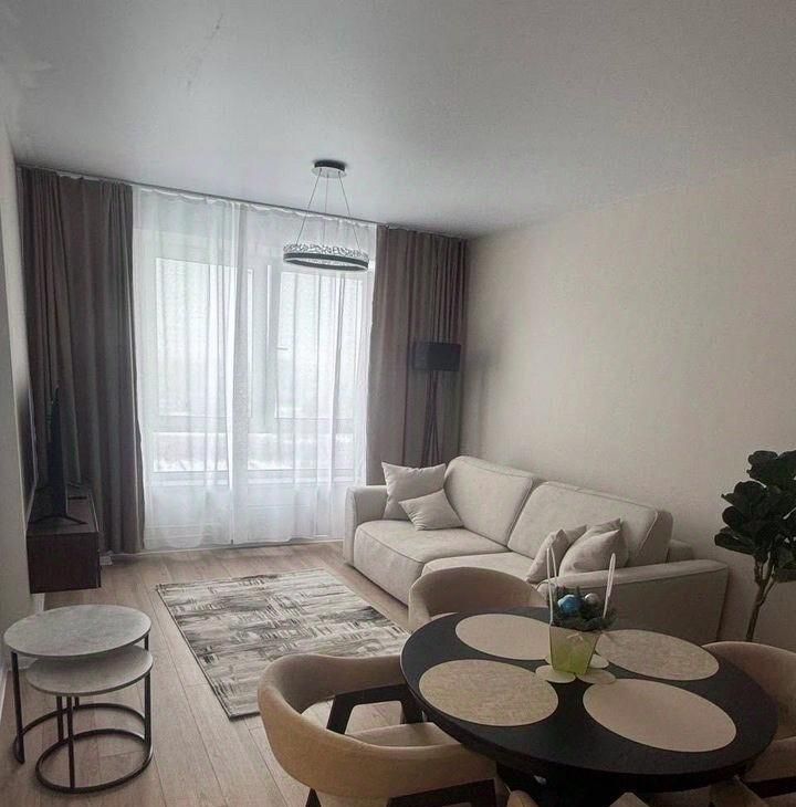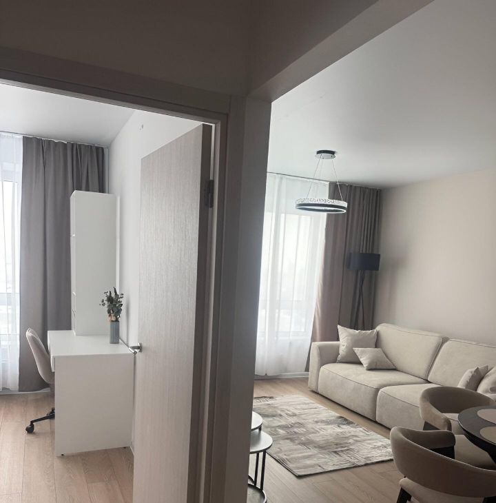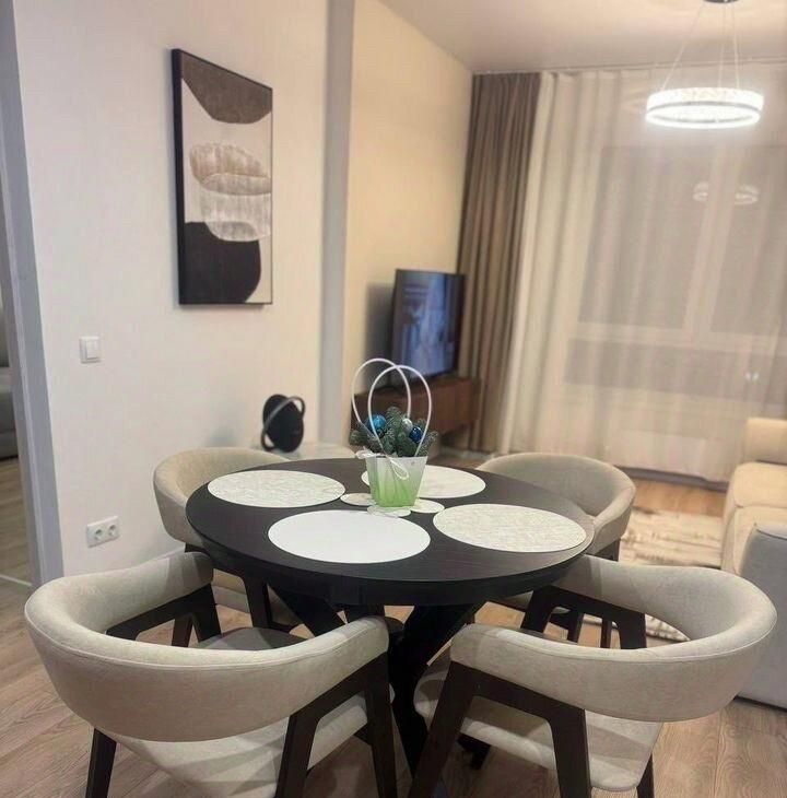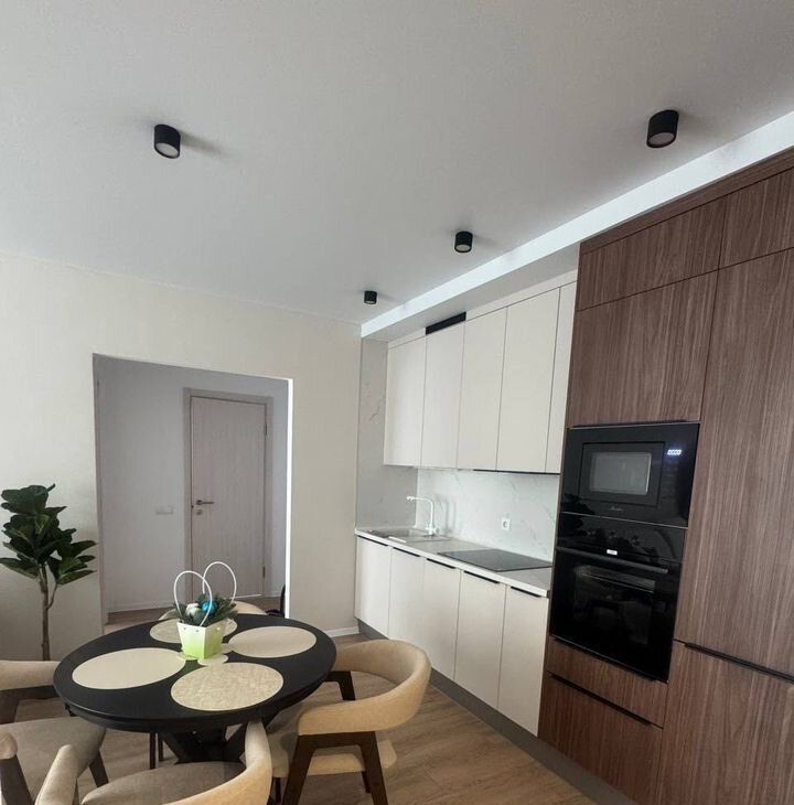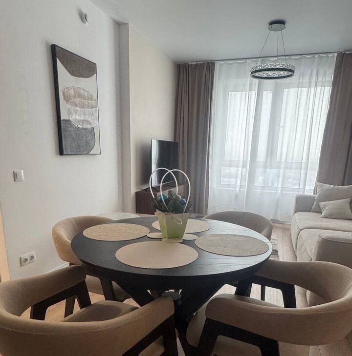 В квартире изолированные комнаты, что обеспечивает комфорт и приватность. Просторная гостиная оборудована современной мебелью: стильным диваном, обеденным столом и стульями. В кухне установлена современная бытовая техника, включая холодильник и микроволновую печь и посудомоечную машину.