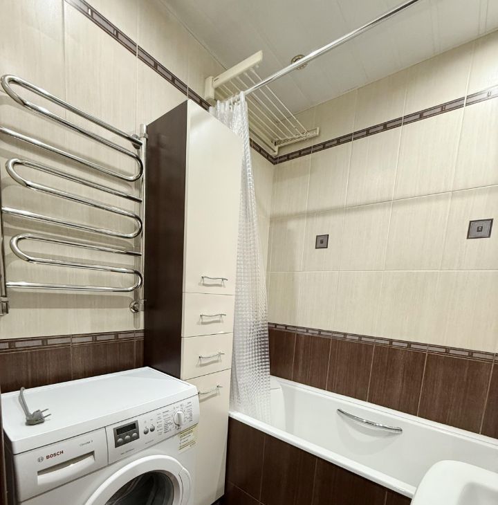 Квартира полностью укомплектована для жизни: установлена необходимая мебель в комнатах и на кухне, кондиционер, холодильник, стиральная машина и ТВ, предусмотрено много мест для хранения вещей.