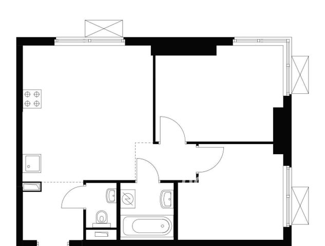 В квартире две изолированные спальни и кухня-гостиная, два сан узла.