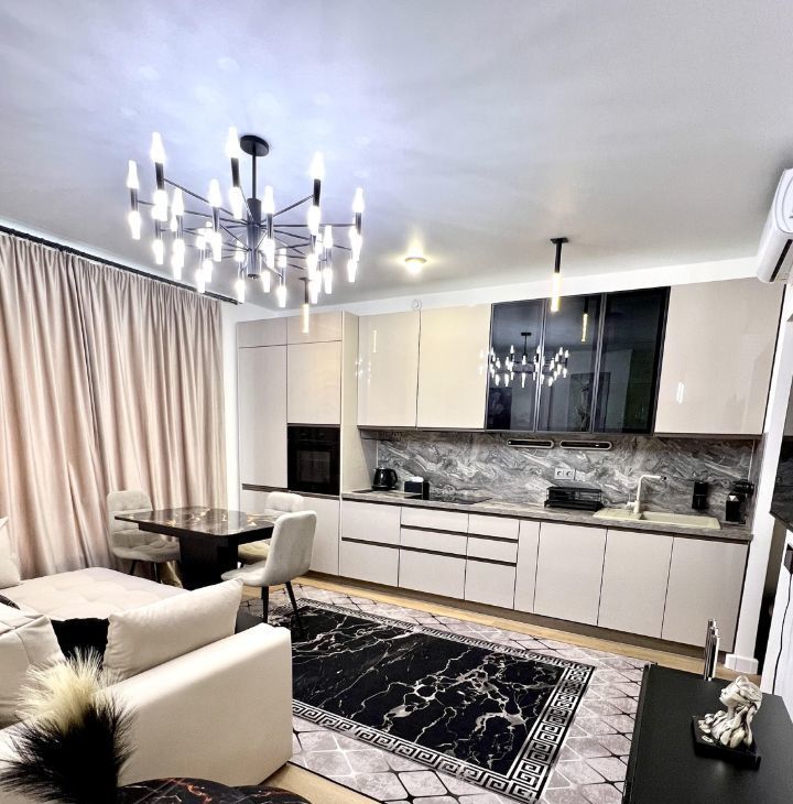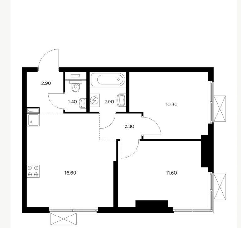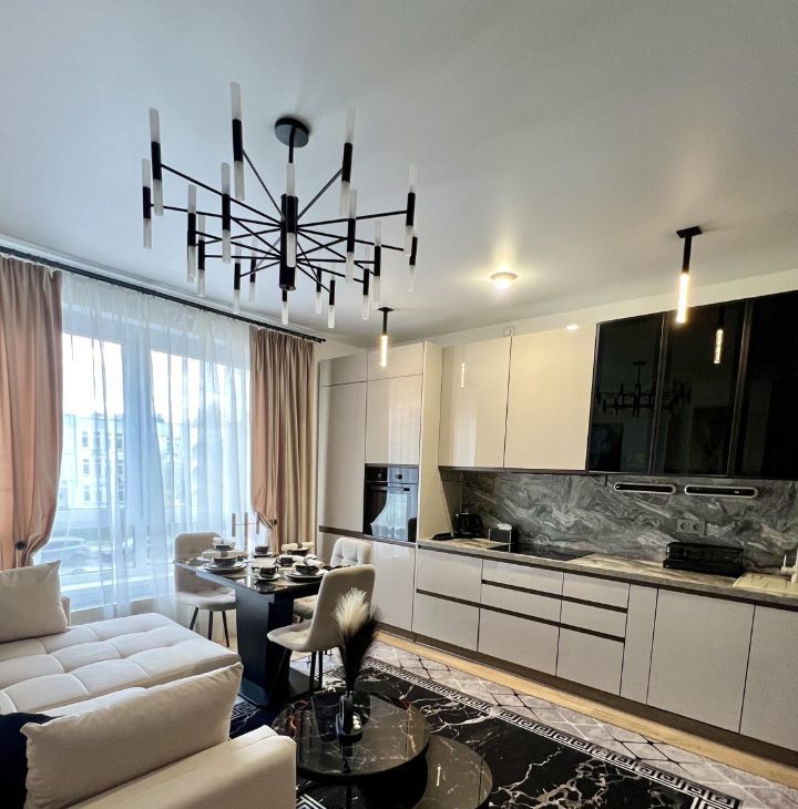 В квартире две изолированные спальни, два санузла, большая кухня-гостиная со столовой зоной.